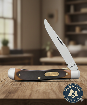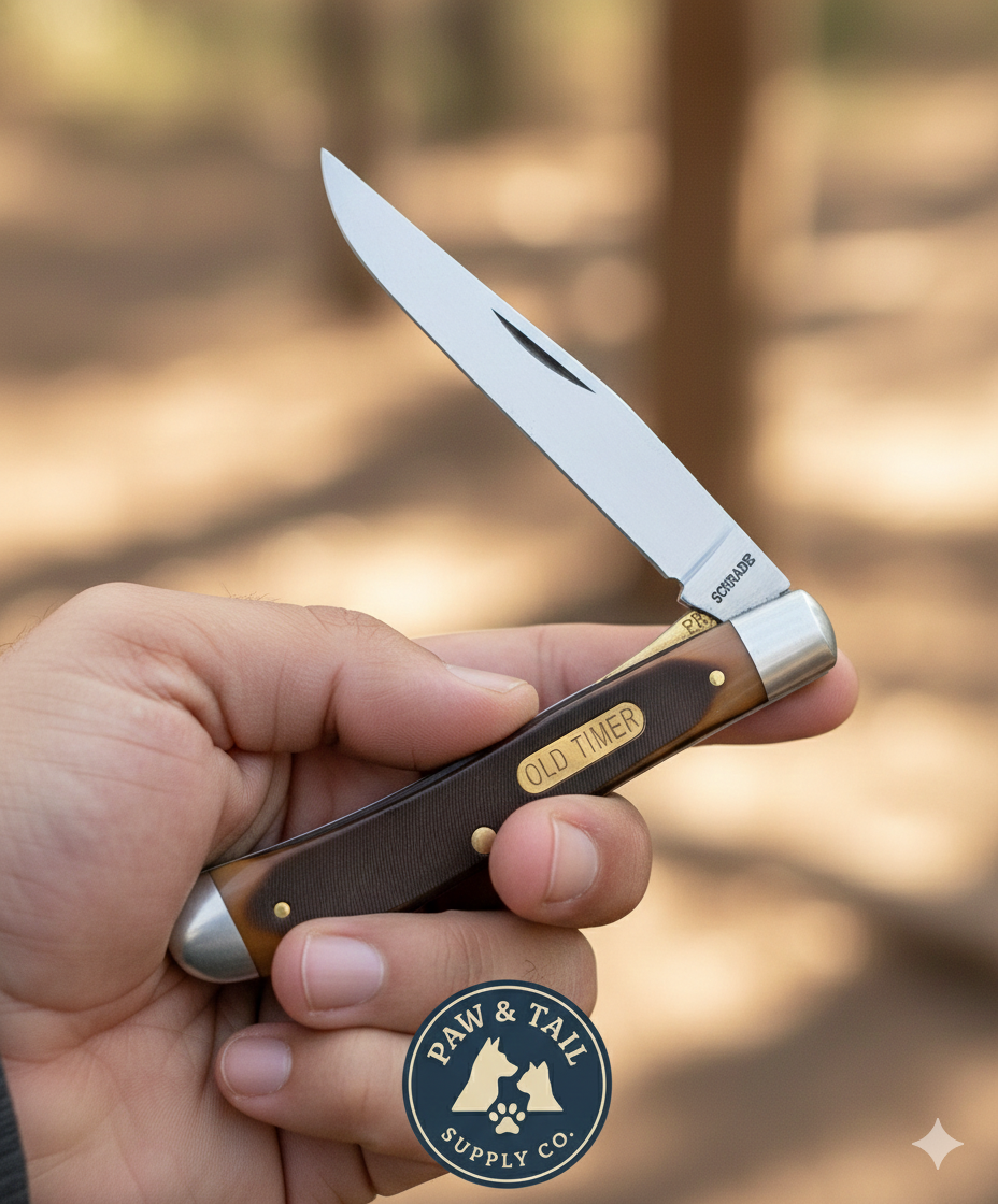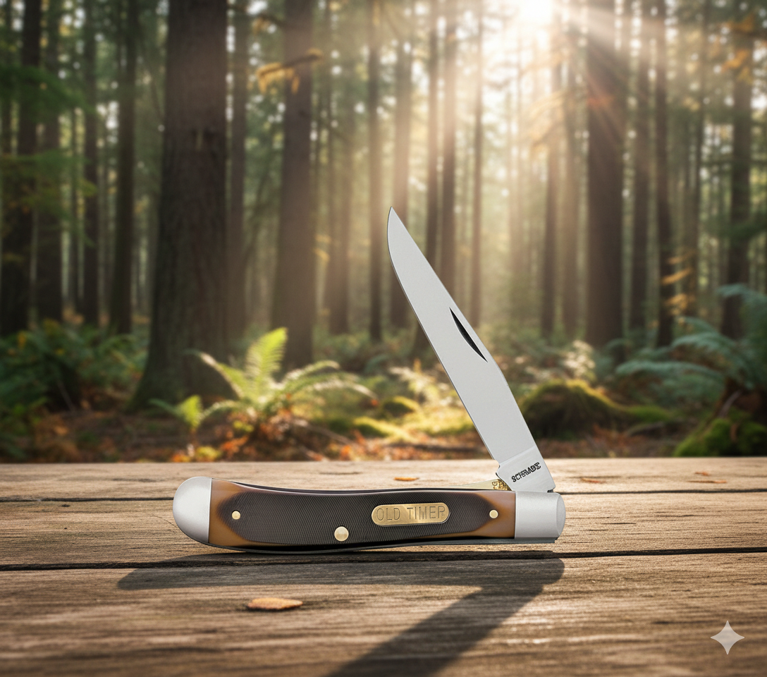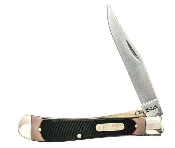 Old Timer 3-7/8" Gunstock Trapper Lockblade folding knife. Features high carbon stainless steel clip point blade, sawcut handle, nickel silver bolsters, brass pins, and heat treated back springs. Classic, durable EDC pocket knife.