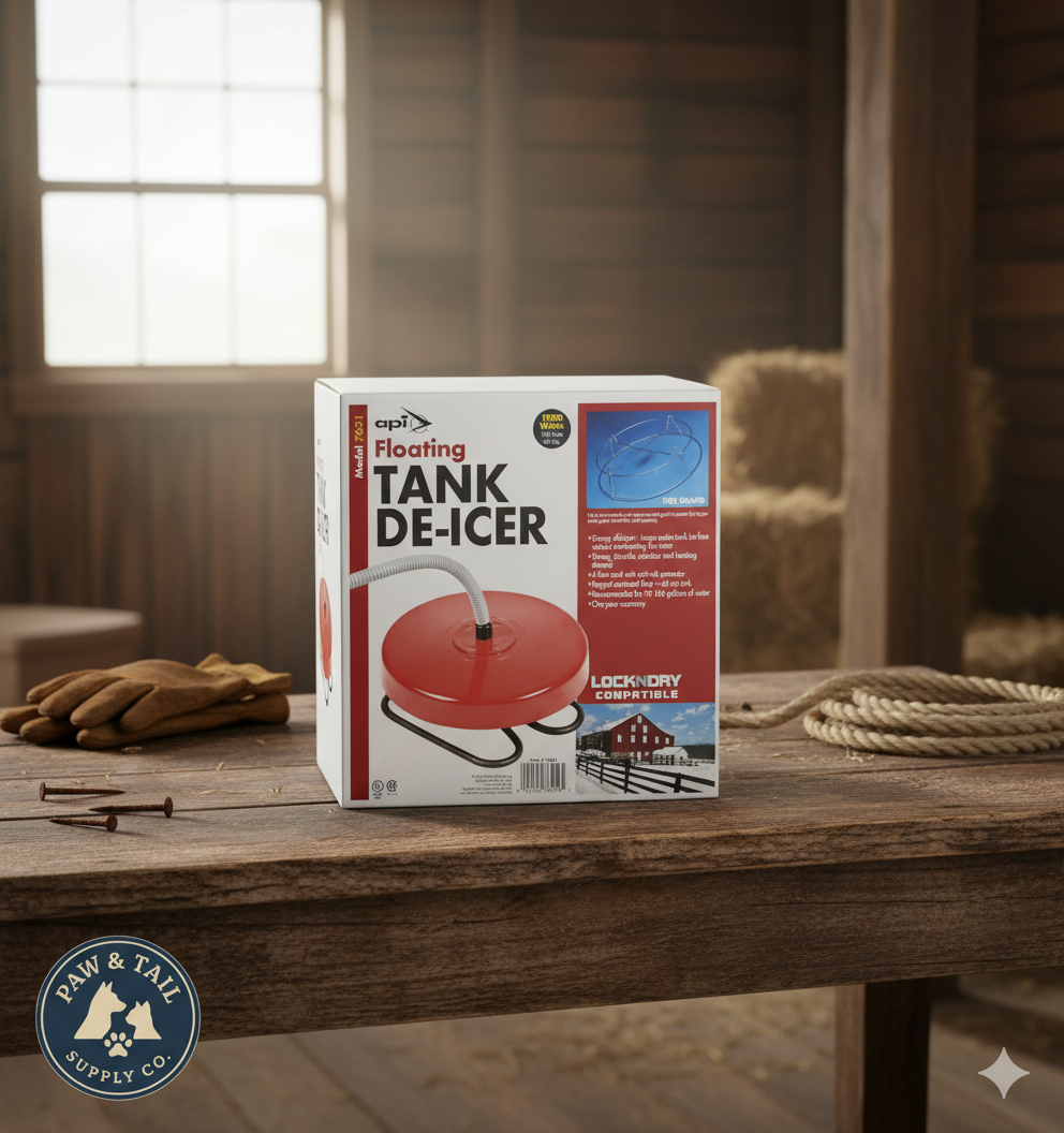 API Floating De-Icer 1000W keeps 70–100 gal stock tanks ice-free all winter. Thermostatic control with thermal feedback prevents overheating. Rugged enclosed float won’t sink; stainless steel heating element. 6 ft anti-rub cord, LOCKNDRY compatible. UL & CSA listed.