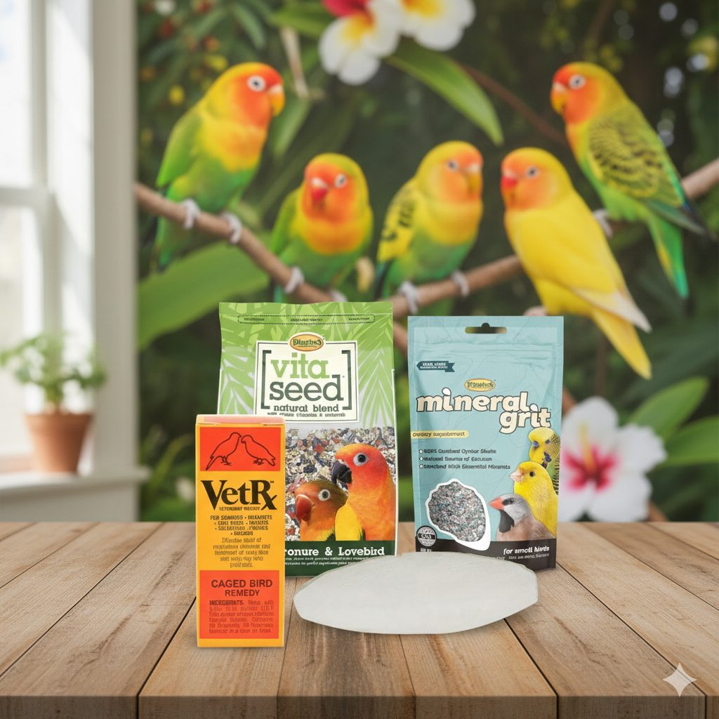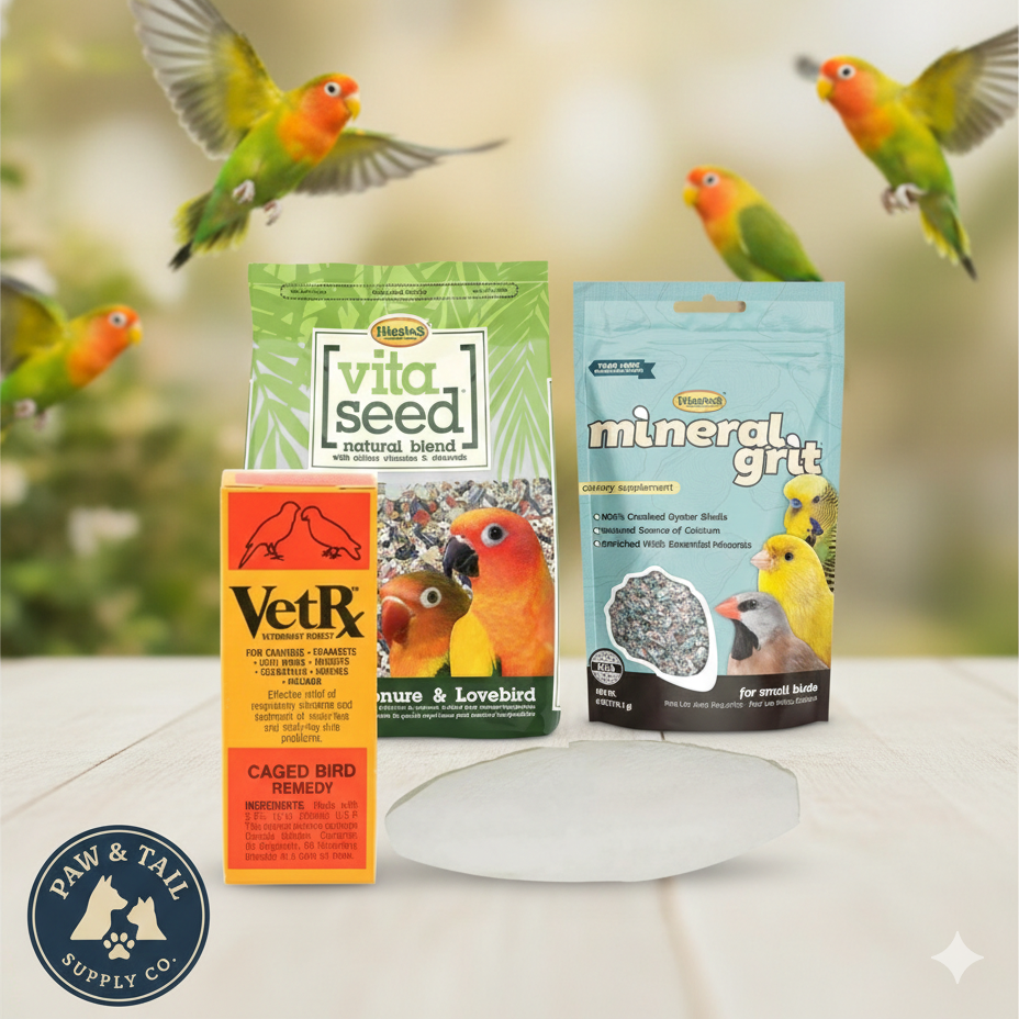 Lovebird Care Bundle 6” Cuttlebone, Mineral Grit, VetRx & Lovebird Food Small Birds