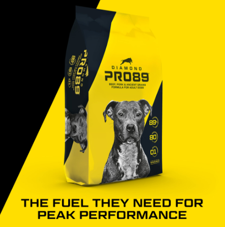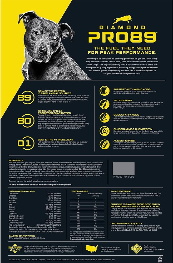 Packed with protein and fortified with amino acids from energy-dense sources, Diamond Pro89 Beef, Pork & Ancient Grains Formula for Adult Dogs gives performance dogs the nutrients they need to support hard work and endurance. And to help build and maintain muscles, 89% of the protein is from animal sources.