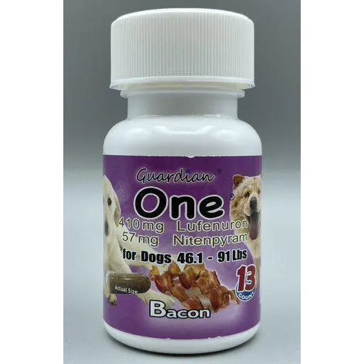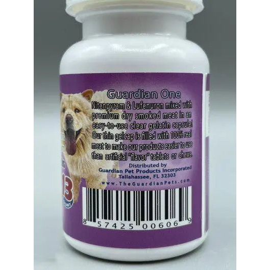Guardian One® for Dogs 46-91lbs 13ct. This flea monthly prevention capsule protects medium to large dogs from infestations. Nitenpyram starts working in just 30 minutes and Lufenuron provides a full 30 days of protection. Both ingredients are considered the gold standard in the pet supply industry. Additionally, they are gentle and time-tested, making them safe for your dog. Plus, with no preservatives or artificial flavors, you can trust that Guardian only uses high-quality, all-natural ingredients. The airtight bottle cap and gelcaps locking design also ensure long-lasting freshness compared to other flea treatments.