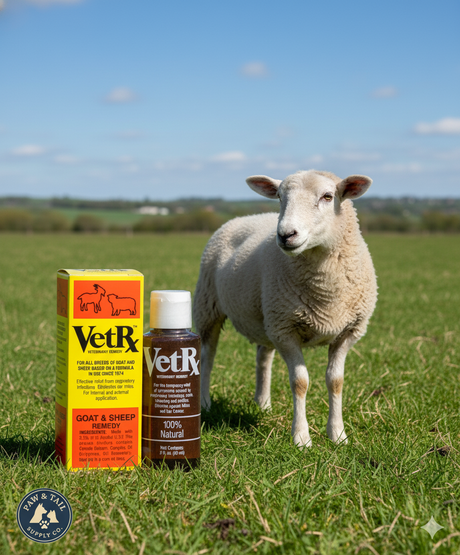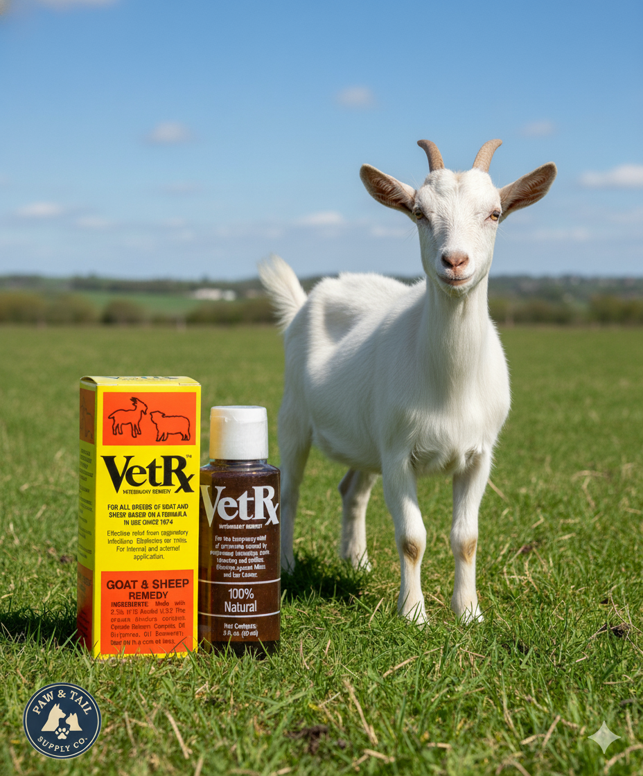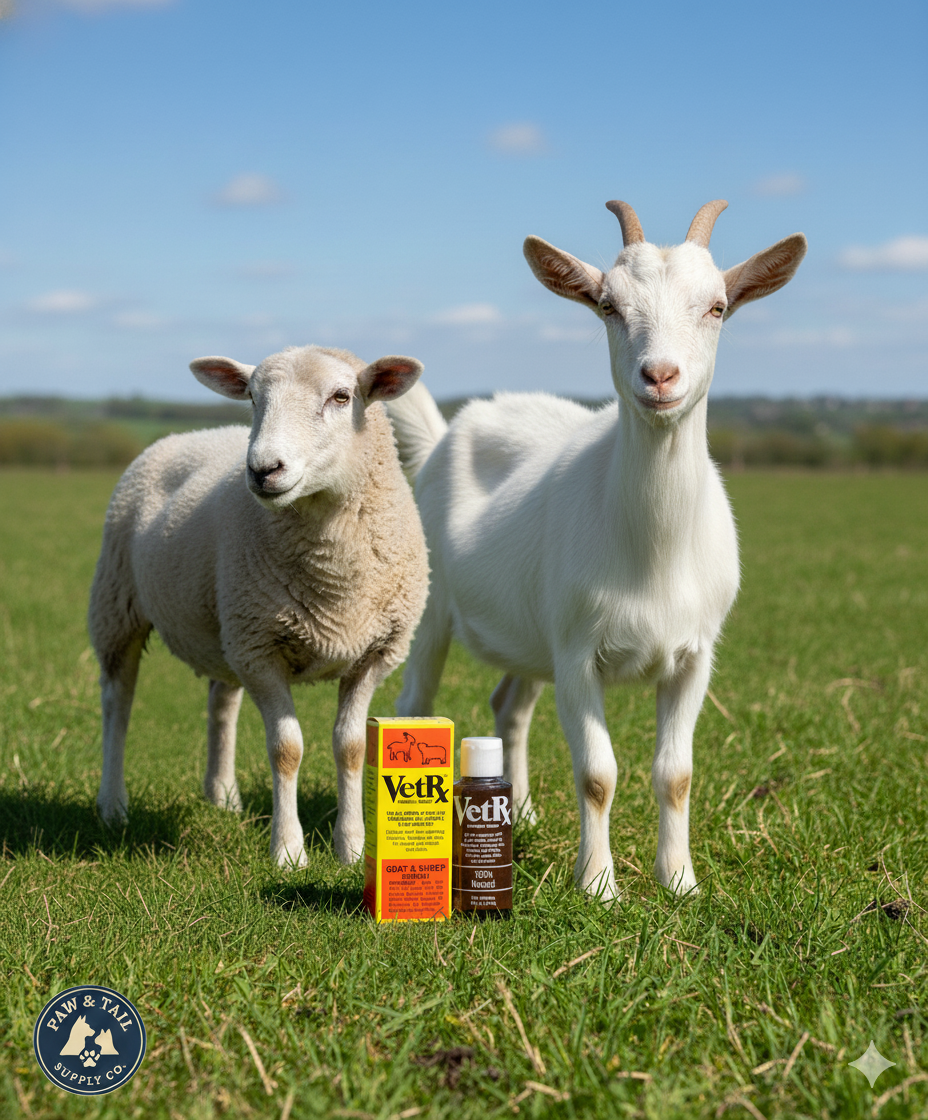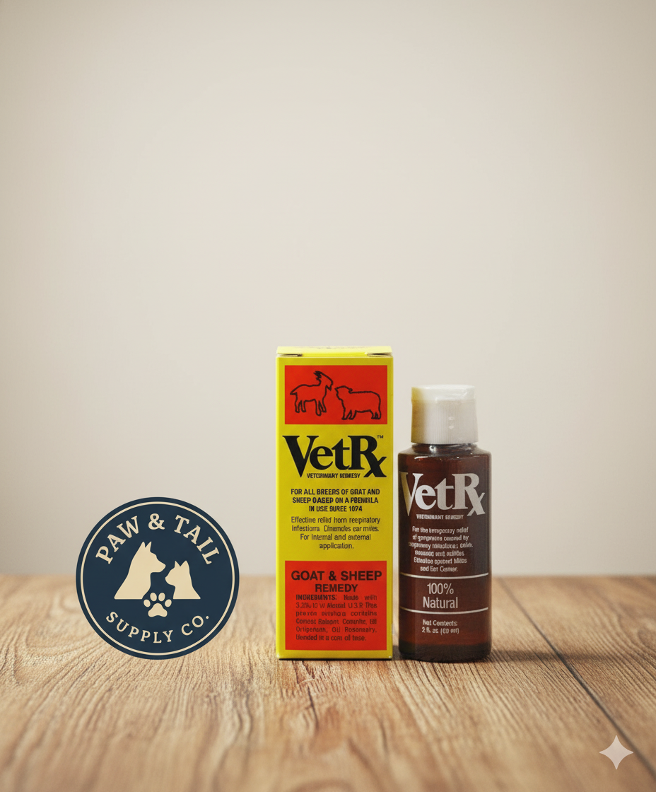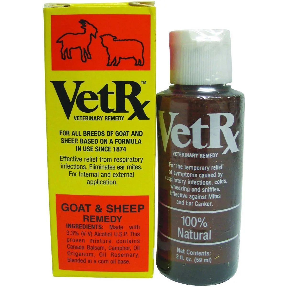VetRx remedy for goats & sheep. Treats respiratory infections & ear mites. For internal & external use. Relieves coughing, sneezing, rattling sounds & loss of appetite. Effective respiratory & ear mite treatment for livestock.