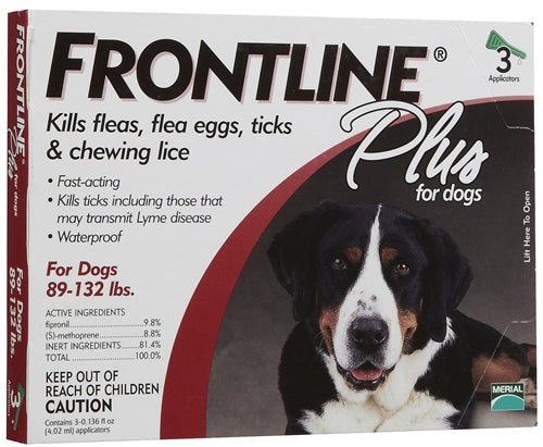 Frontline Plus for Dogs 89-132 lbs, 3-pack. Kills fleas in 24 hrs, ticks in 48 hrs. Destroys flea eggs & larvae to break the flea life cycle. Waterproof; lasts up to 1 month per dose. Fast, effective pest control.