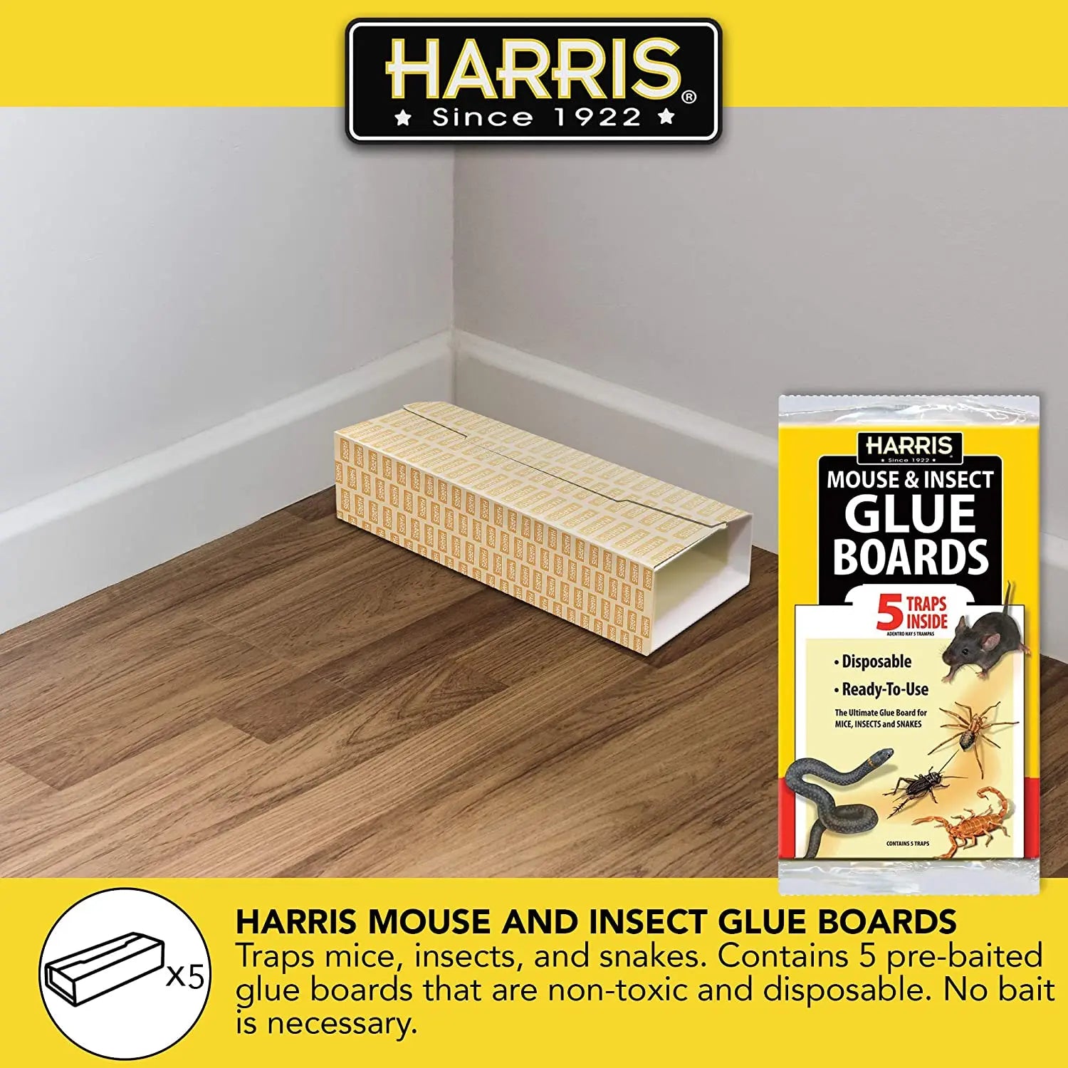 Get rid of unwanted pests with these Harris Glue Boards, 5-Pack. They're large enough to catch many mice and hundreds of insects. These insect glue boards are clean, non-toxic, and easy to use. Each one is scented with a special formula to attract mice and insects, and they can also be used for catching small snakes. They're available in a convenient pack of five and are ready to use.