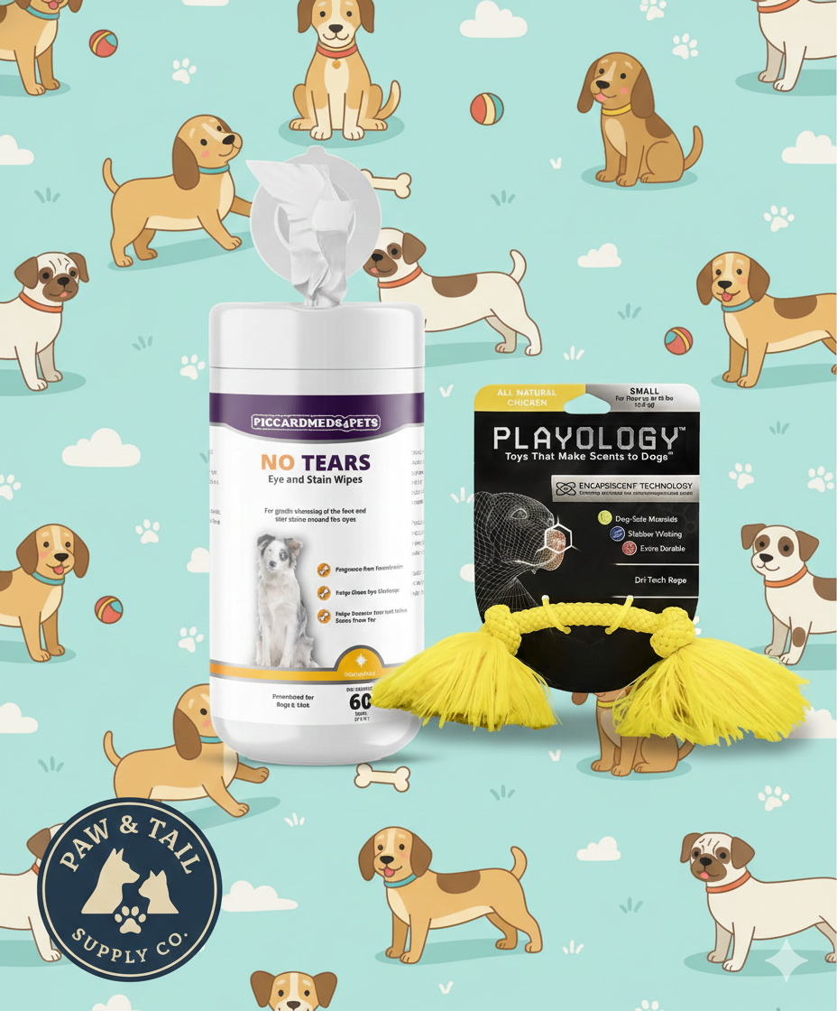 - Bundle: facial/tear stain wipes (60ct) + Dri-Tech rope dog toy