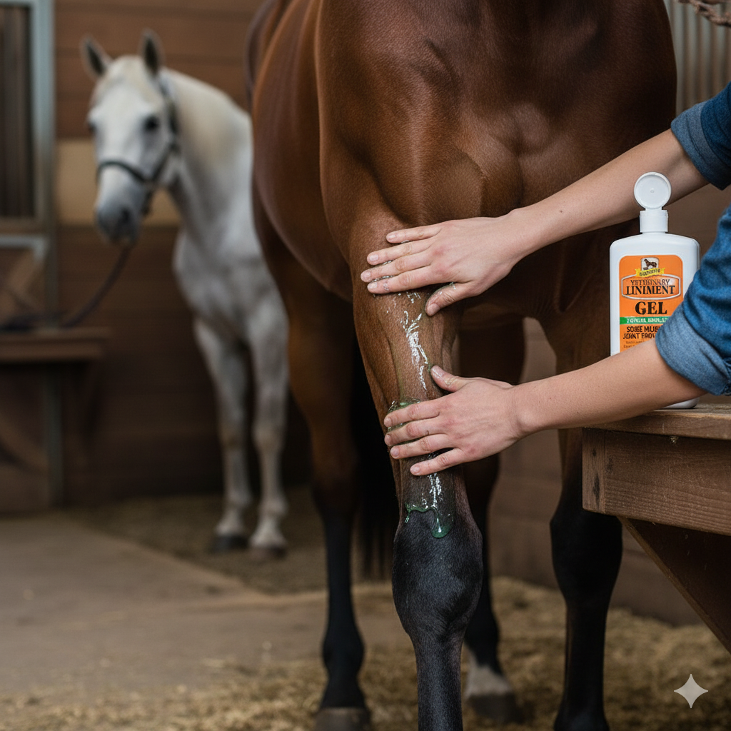 Veterinary Liniment Gel provides targeted, warm, soothing treatment for temporary muscular soreness caused by overexertion, minor injuries, or arthritis pain in horses. This 12 oz spearmint-scented gel contains menthol and natural herbal extracts including Calendula, Echinacea, and wormwood. Loosens stiff joints and reduces swelling. Can be used preventatively before work.