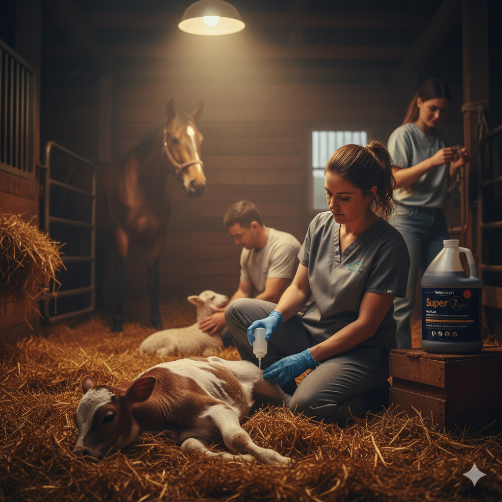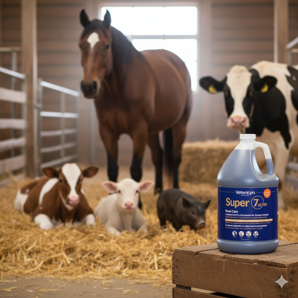 Vetericyn Plus Super 7+ Navel Care is a dry-out solution for drying and protecting umbilical cords of newborn animals. This 1 gallon formula is a safe and effective alternative to 7% tincture of iodine. Quick-drying with an easily identifiable dyed formula. Safe for all animals, including those with torn umbilical cords at birth. No special shipping or handling required.