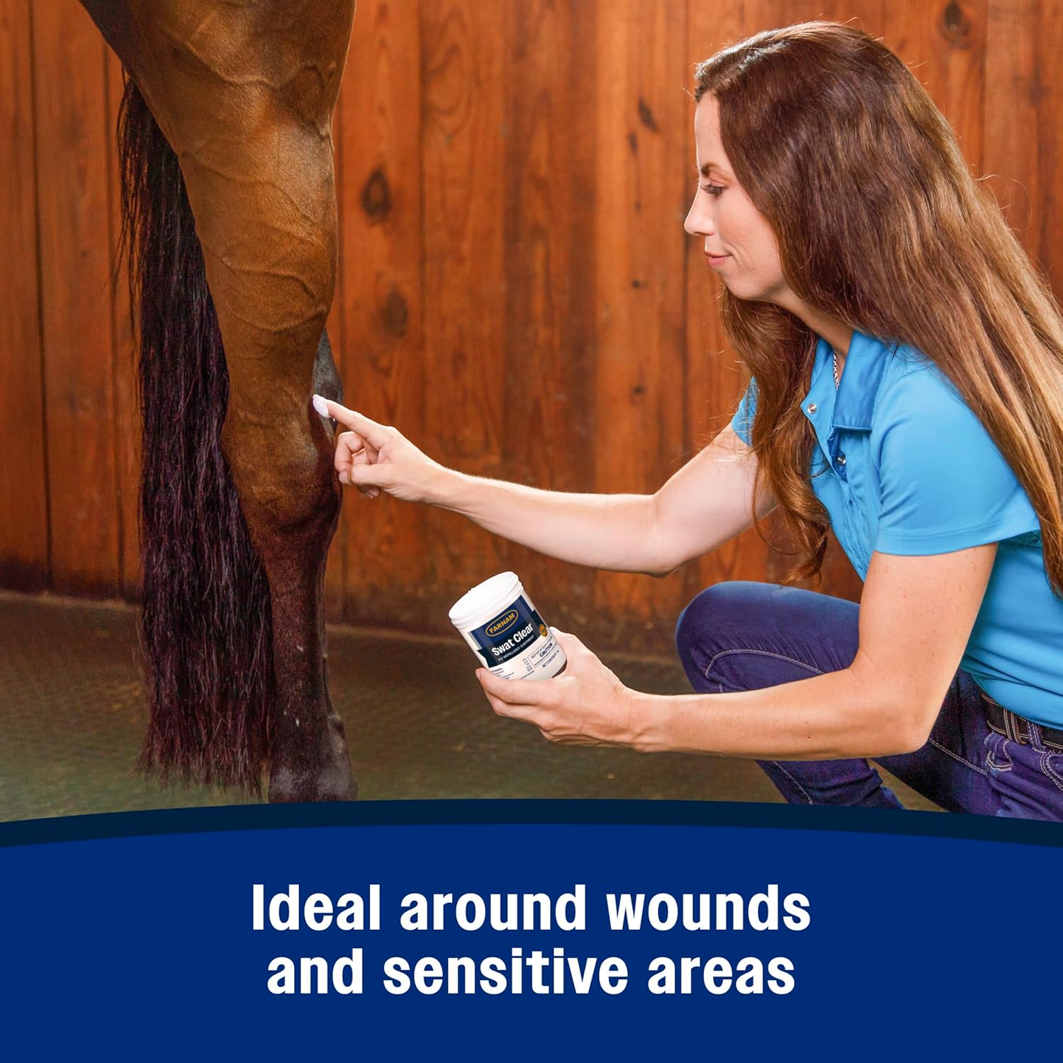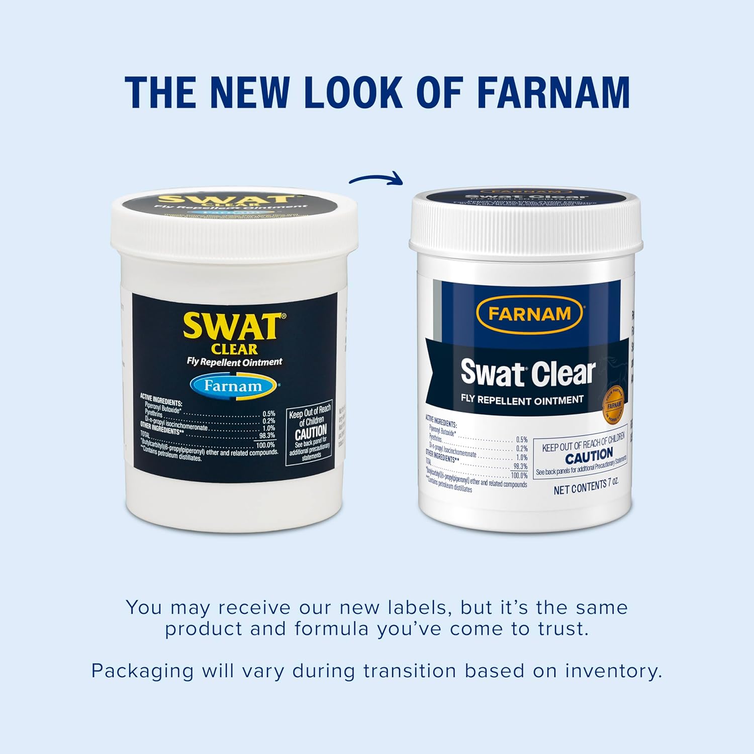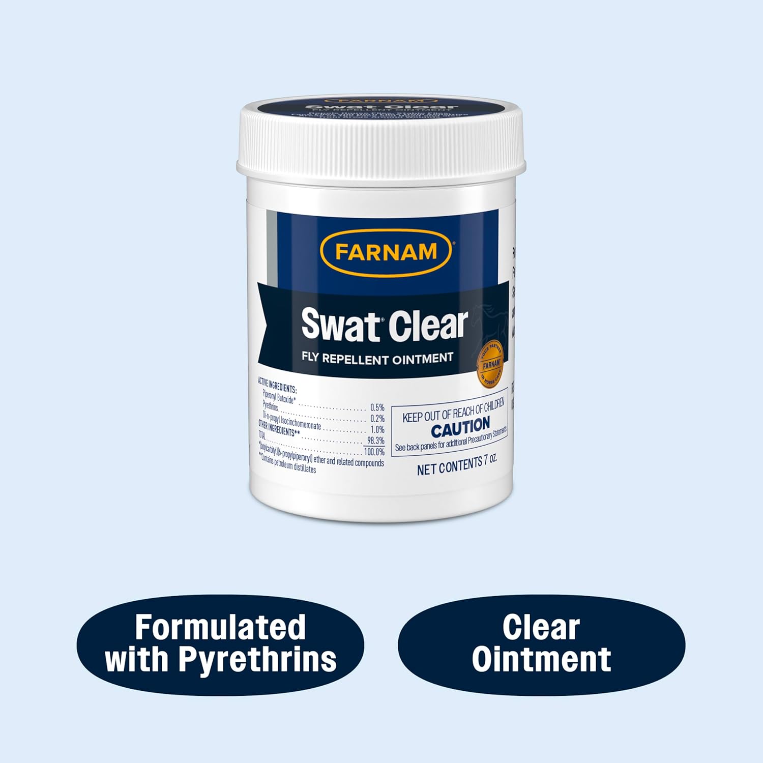 Farnam Swat Clear Fly Repellent Ointment is essential for protecting your horse from flies in sensitive and hard-to-reach areas. Hardworking formula is ideal for use around wounds, sores, scratches, abrasions, and ears to keep pesky flies away. A little goes a long way and doubles as wound care supplies. Easy to store 7-ounce jar is portable for on-the-go use. Apply daily for effective repellent against house, stable, face, and horn flies. Clear formula for discreet use, perfect for show pen. Works great on dogs too!