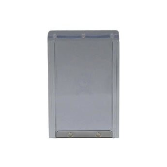 Flap has round logo with rivets on metal bar on vinyl flap.