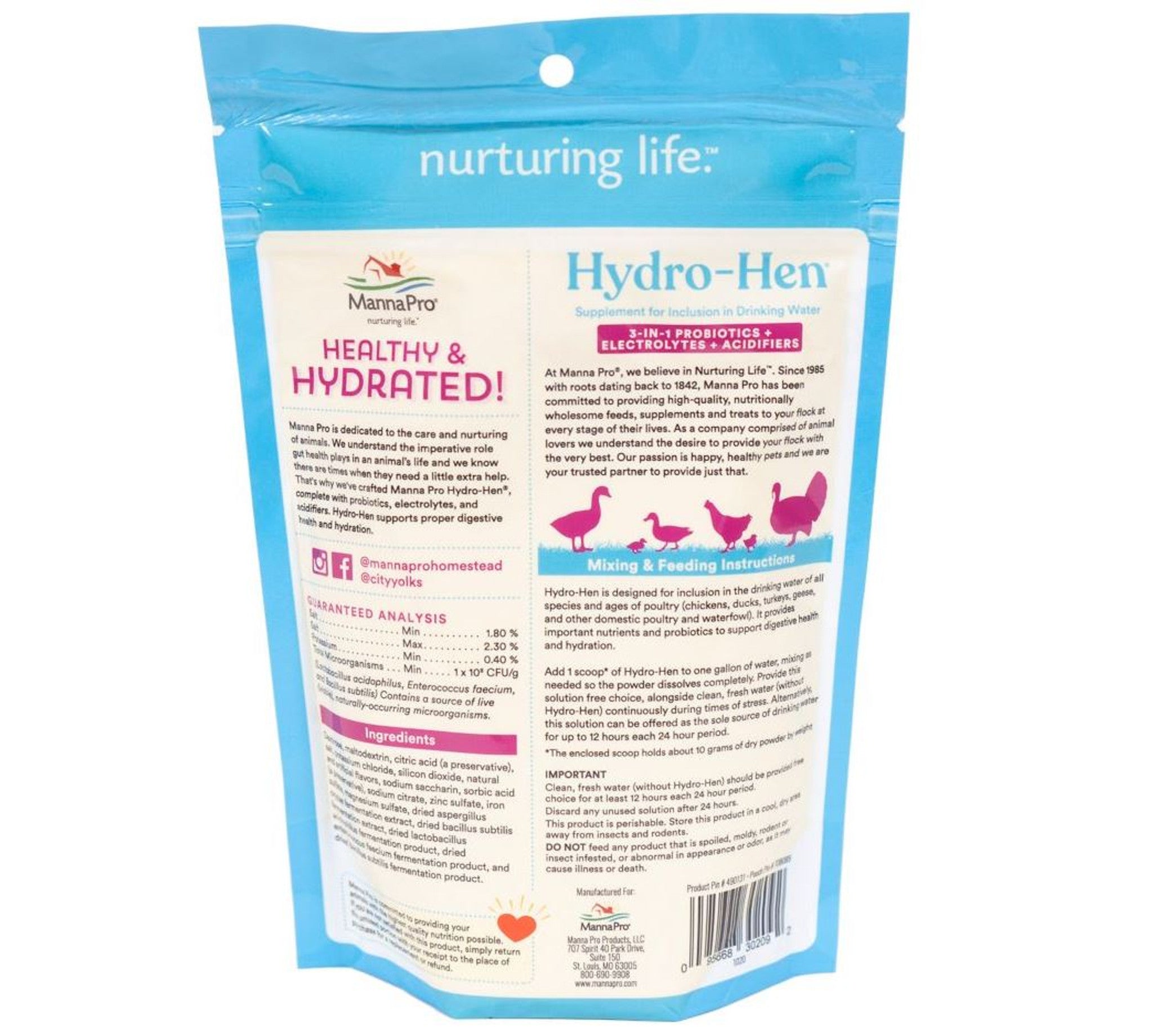 Everything they need in one scoop. Hydro-Hen contains probiotics, electrolytes, and acidifiers to provide hydration and gut health when your birds need it most. Designed for inclusion in the drinking water of all species and ages of poultry (chickens, ducks, turkeys, geese, and other domestic poultry and waterfowl), it provides important nutrients and probiotics to support digestive health and hydration.