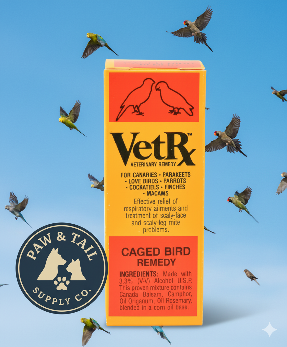 VetRx Caged Bird Remedy 2 oz for canaries, parakeets, parrots, cockatiels, finches & macaws. Relieves watery eyes, labored breathing, coughing, sneezing & loss of voice. Effective against scaly face & leg mites. Internal & external health support.