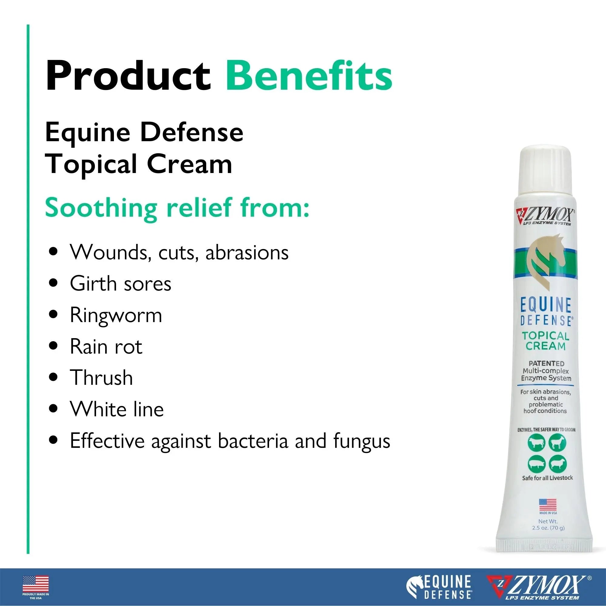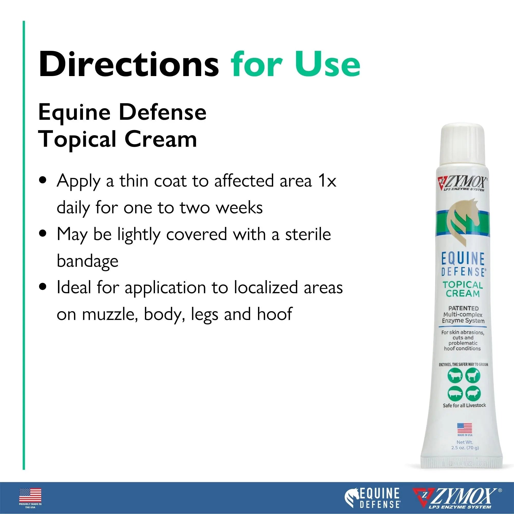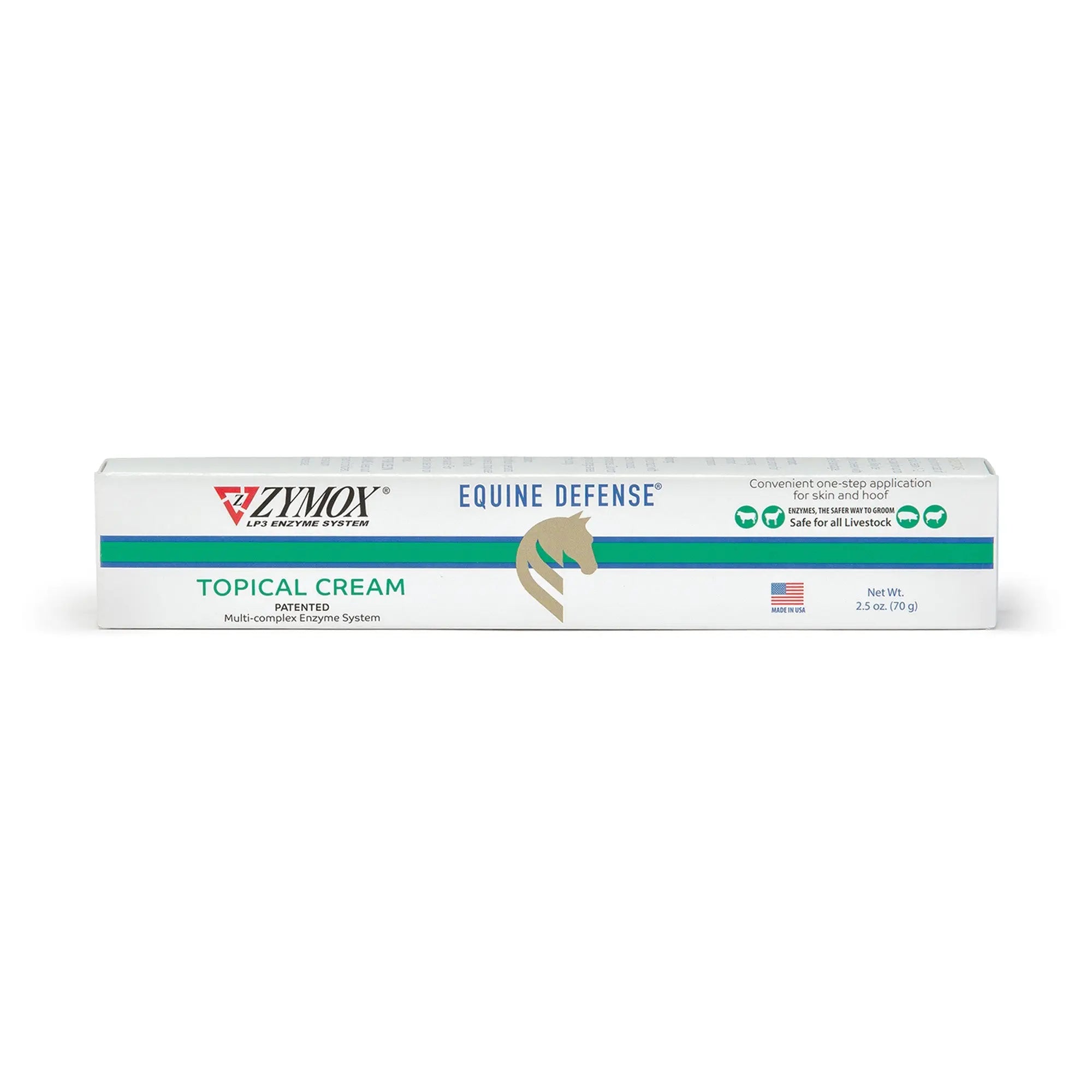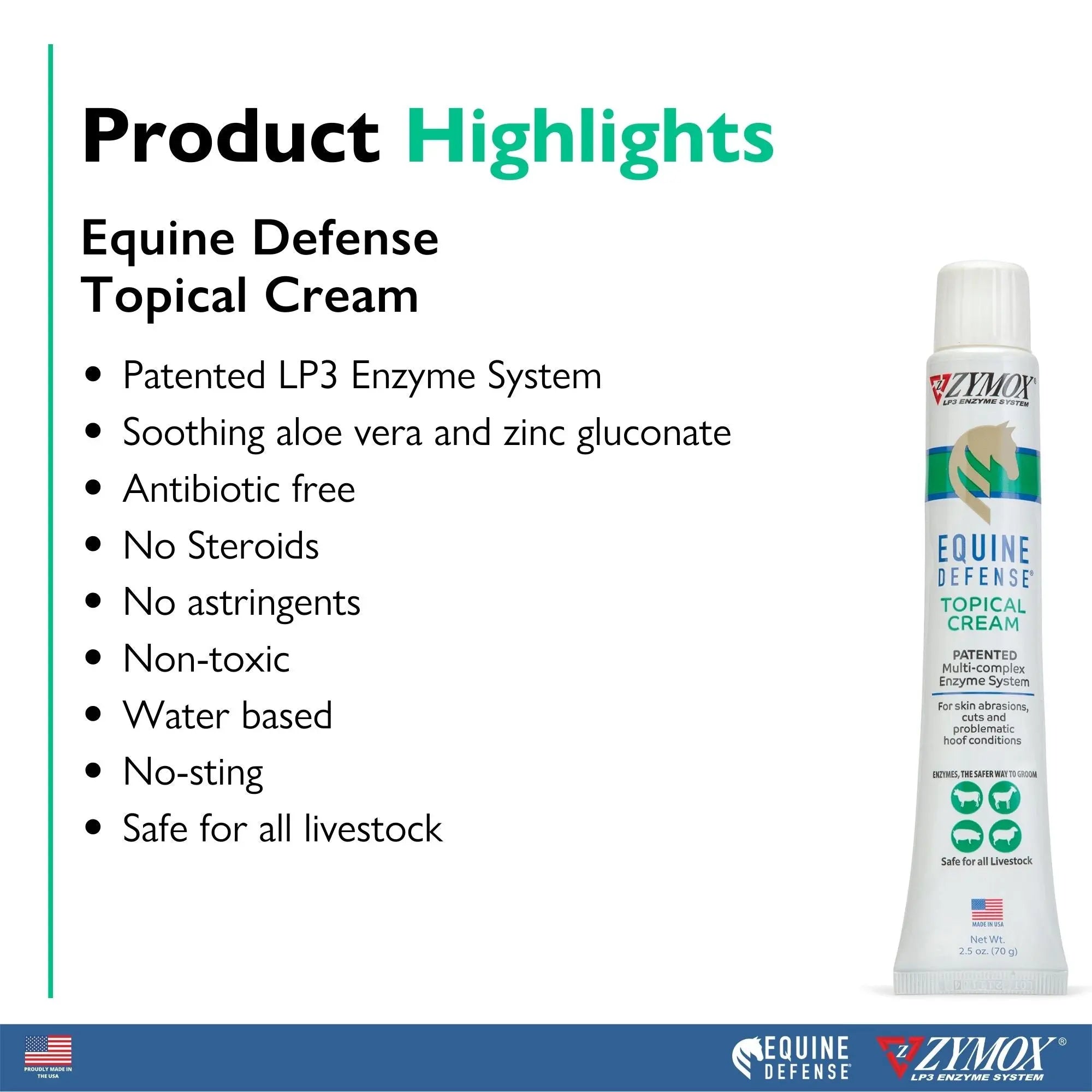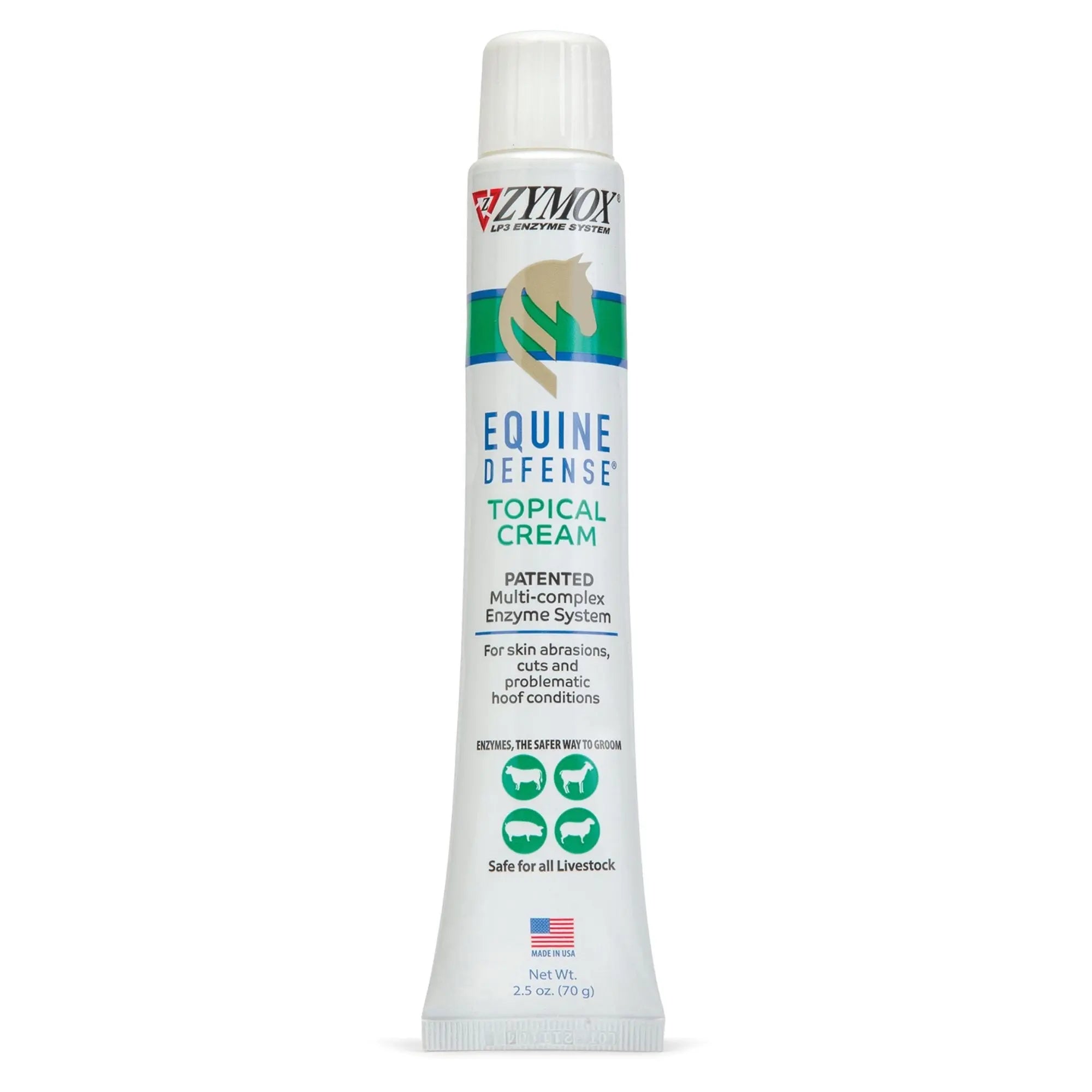 Veterinarian recommended. ZYMOX® Equine Defense Topical Cream to soothe, relieve, and care for wounds cuts, girth sores, thrush, and white line. Formulated with the antimicrobial LP3 Enzyme System plus the natural anti-inflammatory and healing properties of aloe vera and zinc gluconate in a gentle, non-toxic, water-based cream. Free of harsh astringents, isopropyl alcohol, chemicals, antibiotics and steroids.