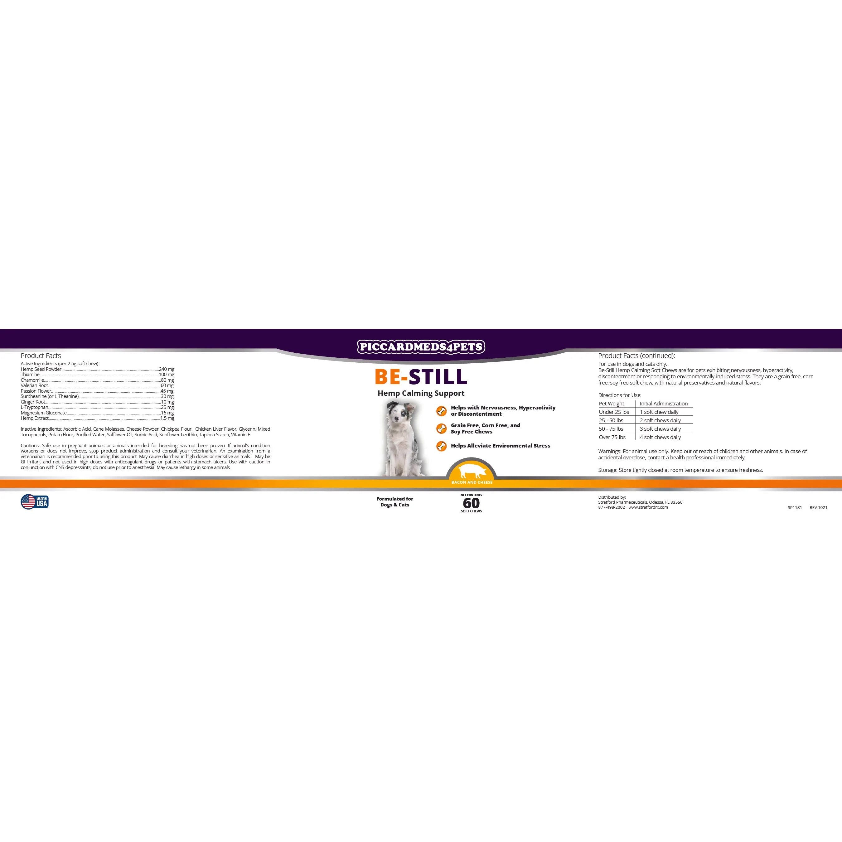 Calm your anxious pets naturally with Piccardmeds4pets Be-Still Hemp Calming Chews. This potent blend of hemp seed powder, chamomile, passion flower, ginger root, and valerian root delivers effective stress relief for both dogs and cats.