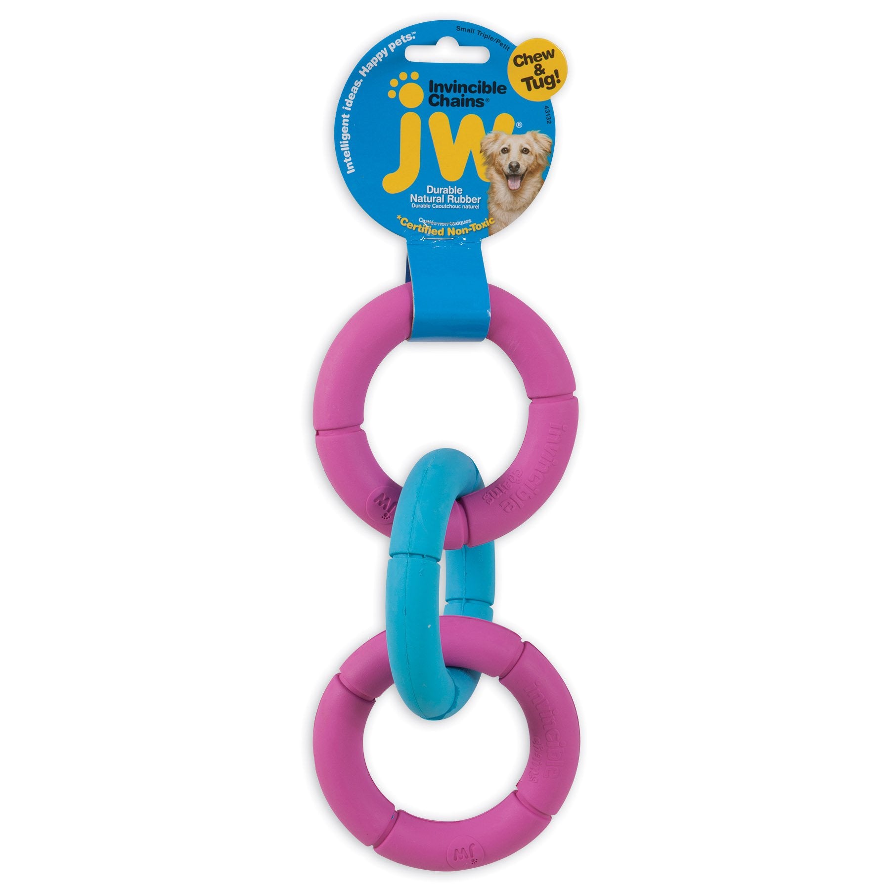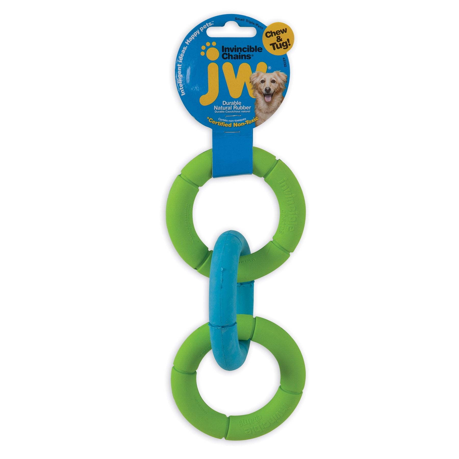 JW Invincible Chains provides your dog with the rubber texture he loves to chew on. Solid, no glue construction stands up to the abuse. A terrific tug as well - easy to hold on to while your dog tugs will all his or her might. Enjoy a game of toss and tug with this unique dog toy.
