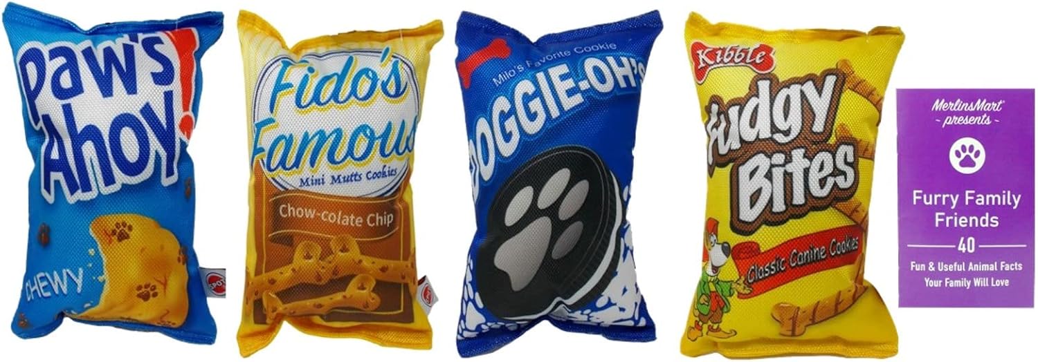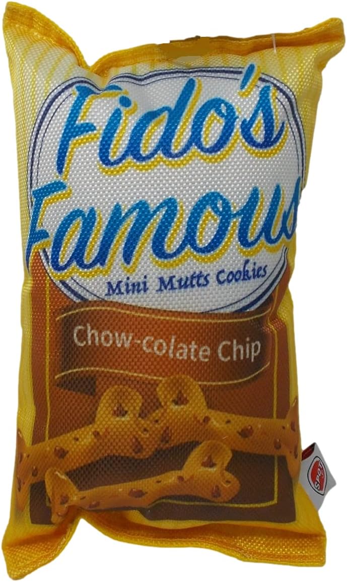 Treat your pup to SPOT's Fun Food "Fido's Famous" cookies toy! This Famous Amos parody features durable ballistic nylon construction with crinkle paper that sounds like a real cookie bag, plus a squeaker for double the fun.