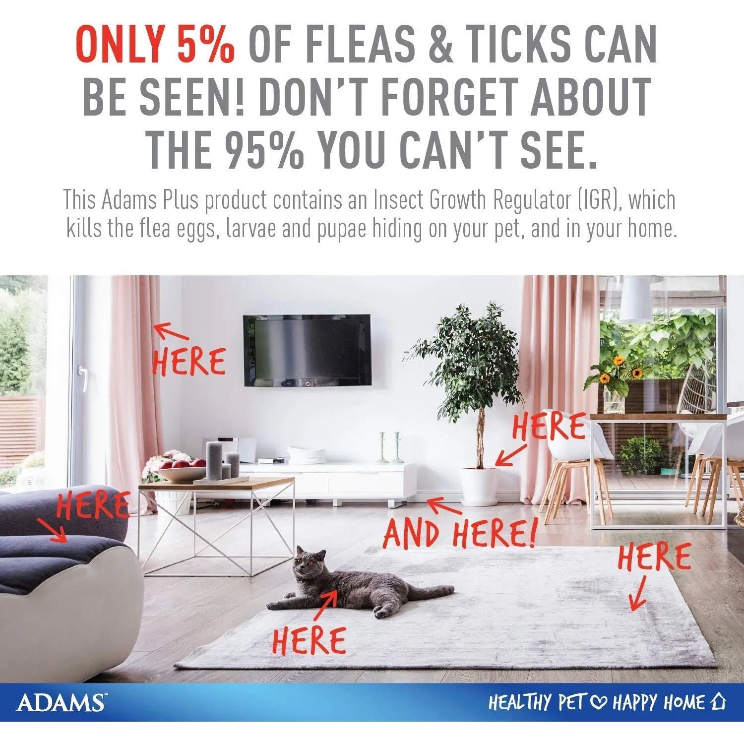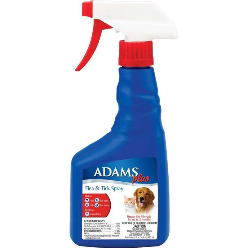Adams Plus Flea & Tick Spray kills adult fleas, flea eggs, flea larvae, and ticks and repels mosquitoes. This spray prevents flea eggs from hatching for up to 2 months. Adams Plus Flea & Tick Spray combines the adult flea killing power of etofenprox with the long-lasting flea egg-killing power of S-Methoprene insect growth regulator (IGR). This highly effective combination of ingredients provides quick relief from biting fleas and continuously kills flea eggs laid on the animal, breaking the flea life cycle.