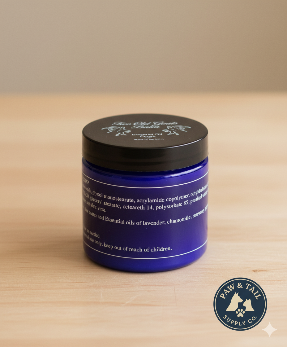 Two Old Goats Essential Oil Body Balm 4 oz tackles tough aches & pains from swelling, fibromyalgia, gout or injury. Goat's milk base with 6 essential oils: chamomile, lavender, rosemary, peppermint, eucalyptus & birch. Anti-inflammatory & analgesic. Instant relief, no medicinal odor.