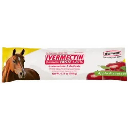 Durvet Apple flavored paste Horse Bot Parasites wormer Equine Tube OTC it controls 35 species and stages of worms and bots in a single dose, with a wide margin of safety for horses of all ages, no documented parasite resistance in horses.