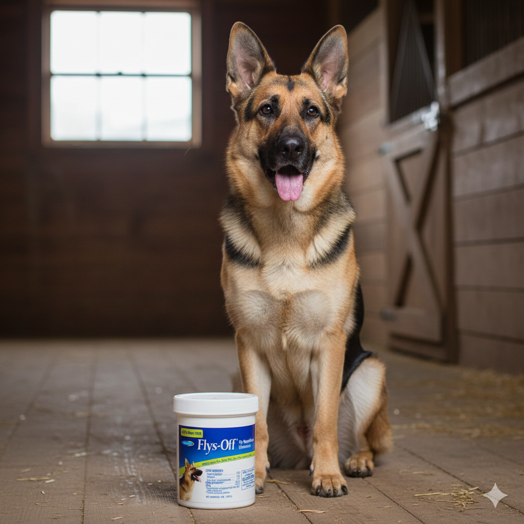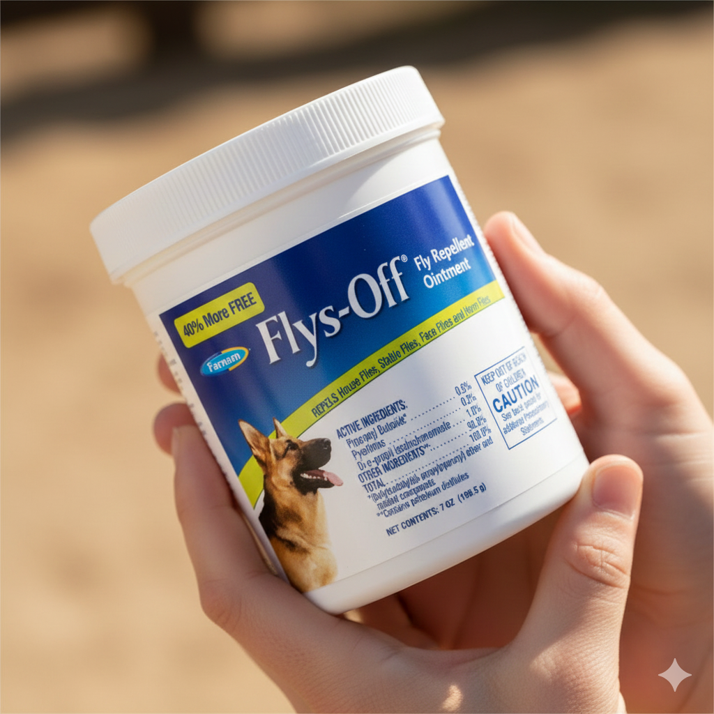 Flys-Off is a specially formulated ointment for dogs and horses. It protects wounds and sores by killing or repelling flies. The ointment is applied directly to the wound or abrasion.