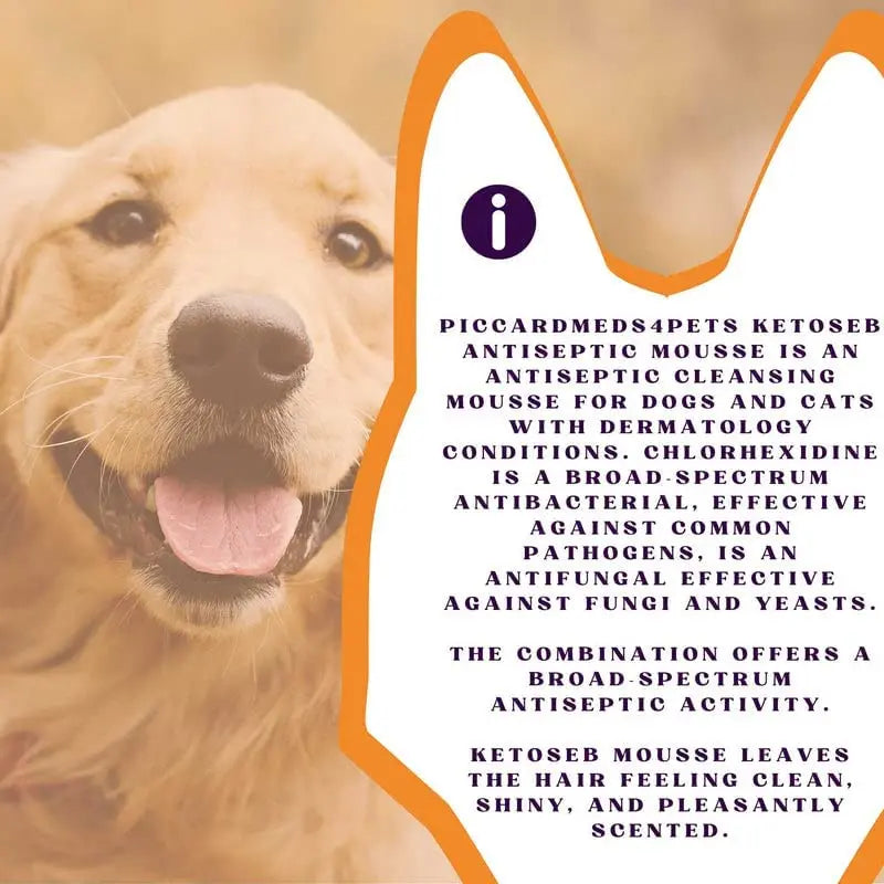 Treat common dermatology conditions with Piccardmeds4pets Keto-Seb Antiseptic Mousse. This veterinary-formulated solution with chlorhexidine and pathogen effectively targets bacteria, fungi, and yeasts for healthier skin and coat, plus includes a FREE green camo bandana.
