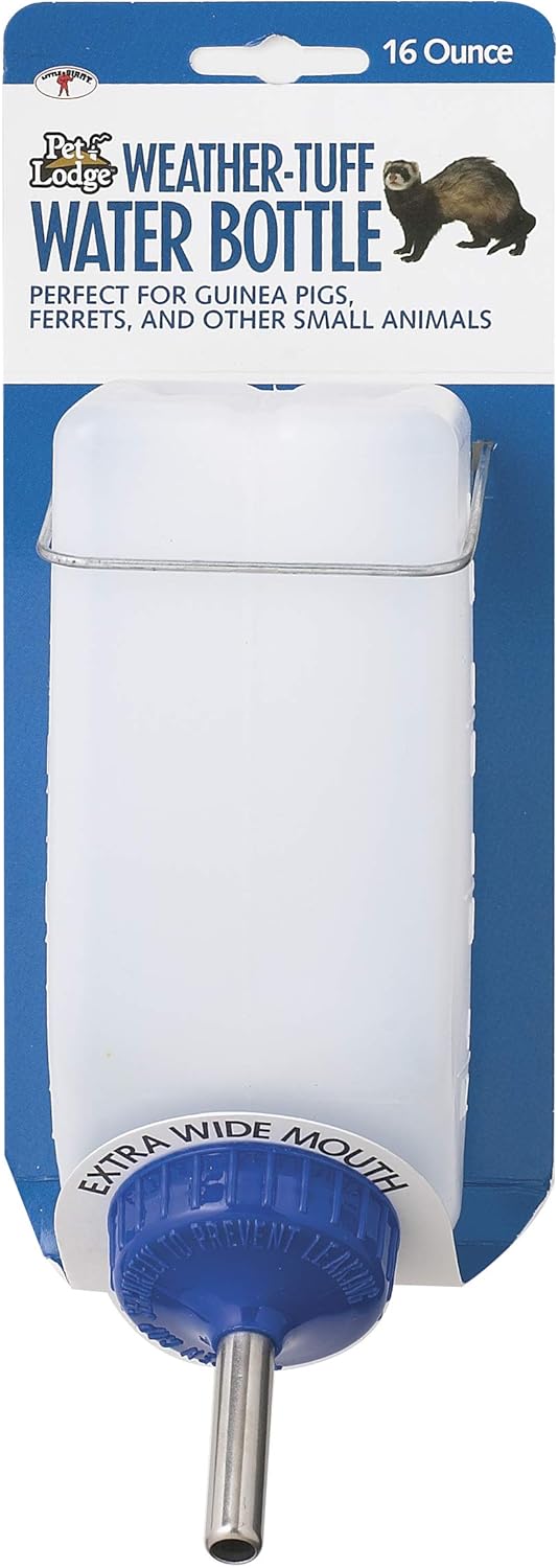 Pet Lodge Weather-Tuff 16 oz water bottle made from UV-resistant polyethylene with stainless steel ballpoint tube. Keeps water clean and cages dry. Ideal for outdoor use with guinea pigs, ferrets & other small animals.