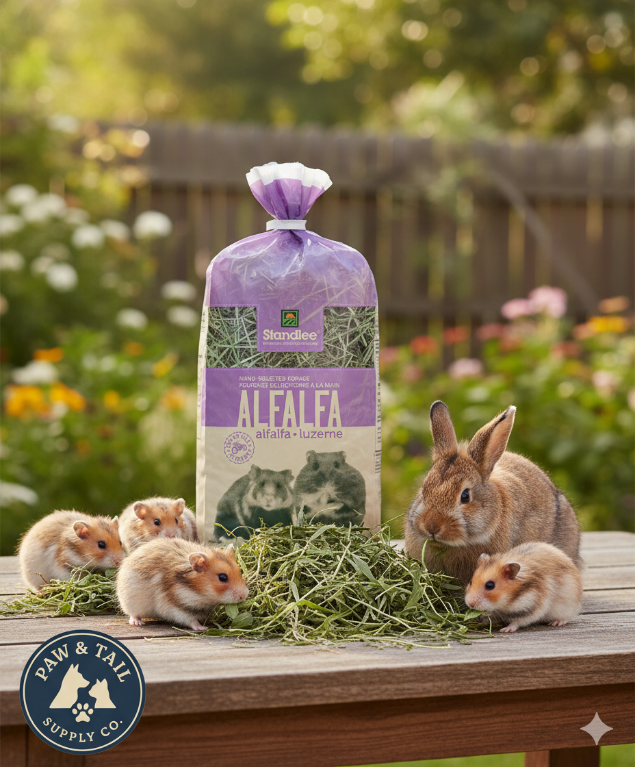 Standlee Premium Alfalfa hay for small animals. Sun‑cured, hand‑selected, all‑natural forage with high digestible fiber and moderate protein. Great for pregnant or growing herbivores; supports dental, digestive health and natural foraging.