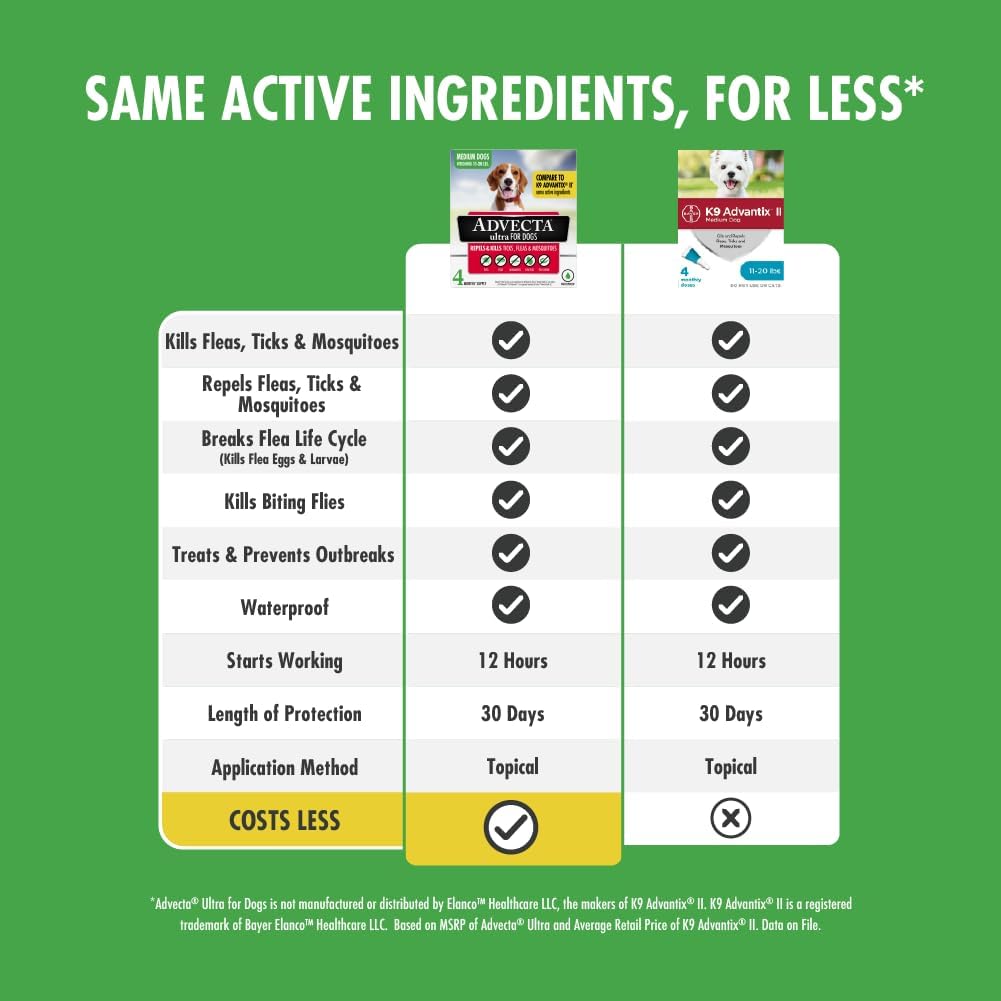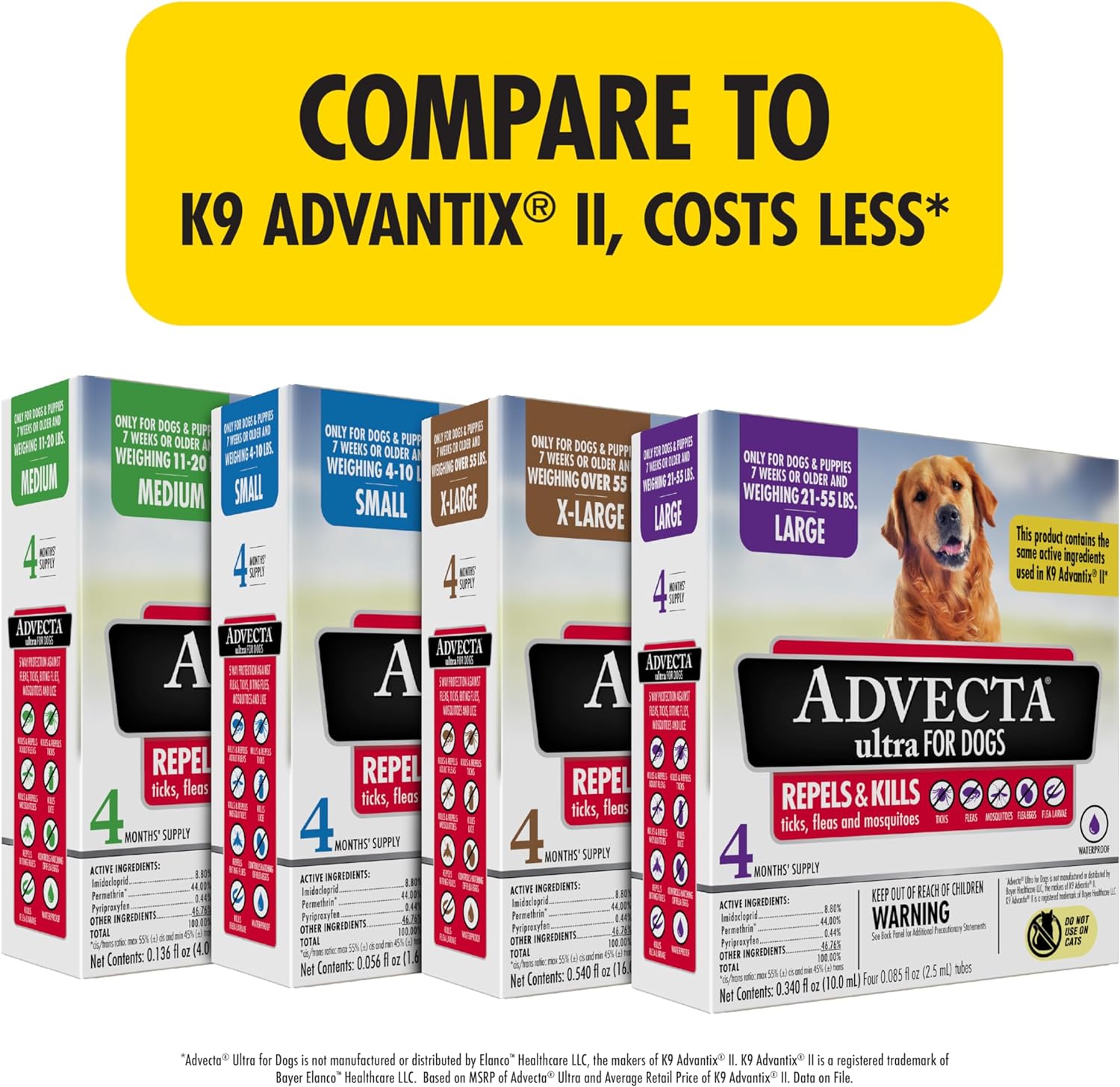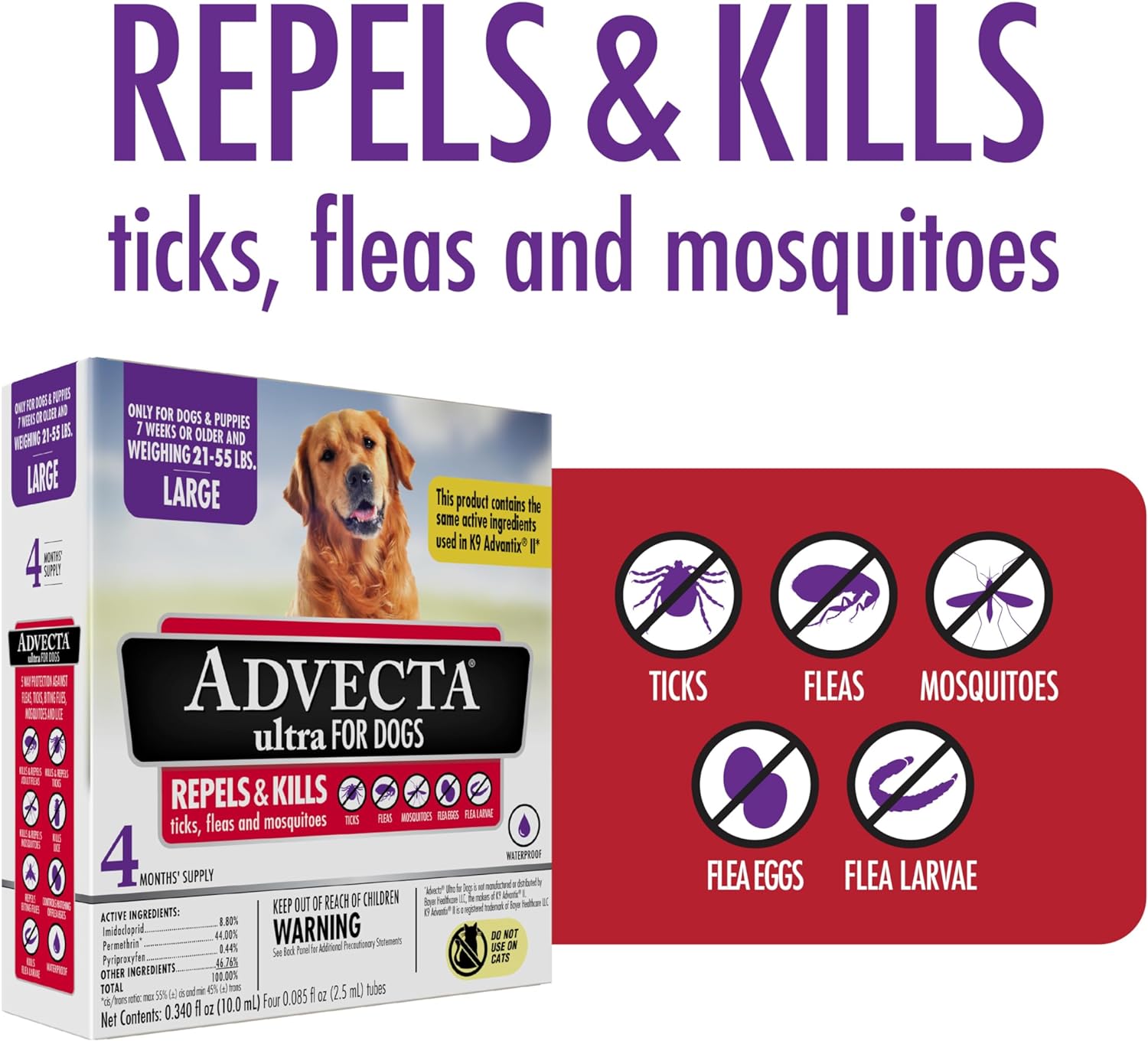Advecta Ultra for dogs is a monthly topical treatment and prevention of ticks, fleas, mosquitoes, biting flies & lice. Advecta Ultra contains the same active ingredients used in bayer K9 Advantix II for dogs. Advecta Ultra provides broad protection against fleas, ticks, mosquitoes, biting flies, and chewing lice. It breaks the flea life cycle, killing all life stages of fleas, including adults, eggs, and larvae. Advecta Ultra is a convenient monthly topical for Dogs that kills through contact. This means that fleas, ticks, and mosquitoes don’t have to bite your dog to die.