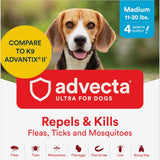 Advecta Ultra Flea & Tick Protection for Dogs uses the same active ingredients as K9 Advantix. Starts working through contact to kill and repel fleas, ticks, and mosquitoes within 12 hours with no prescription needed. Waterproof, fast-acting topical drops provide 30-day protection at an affordable price. 4-month supply for medium dogs and puppies.