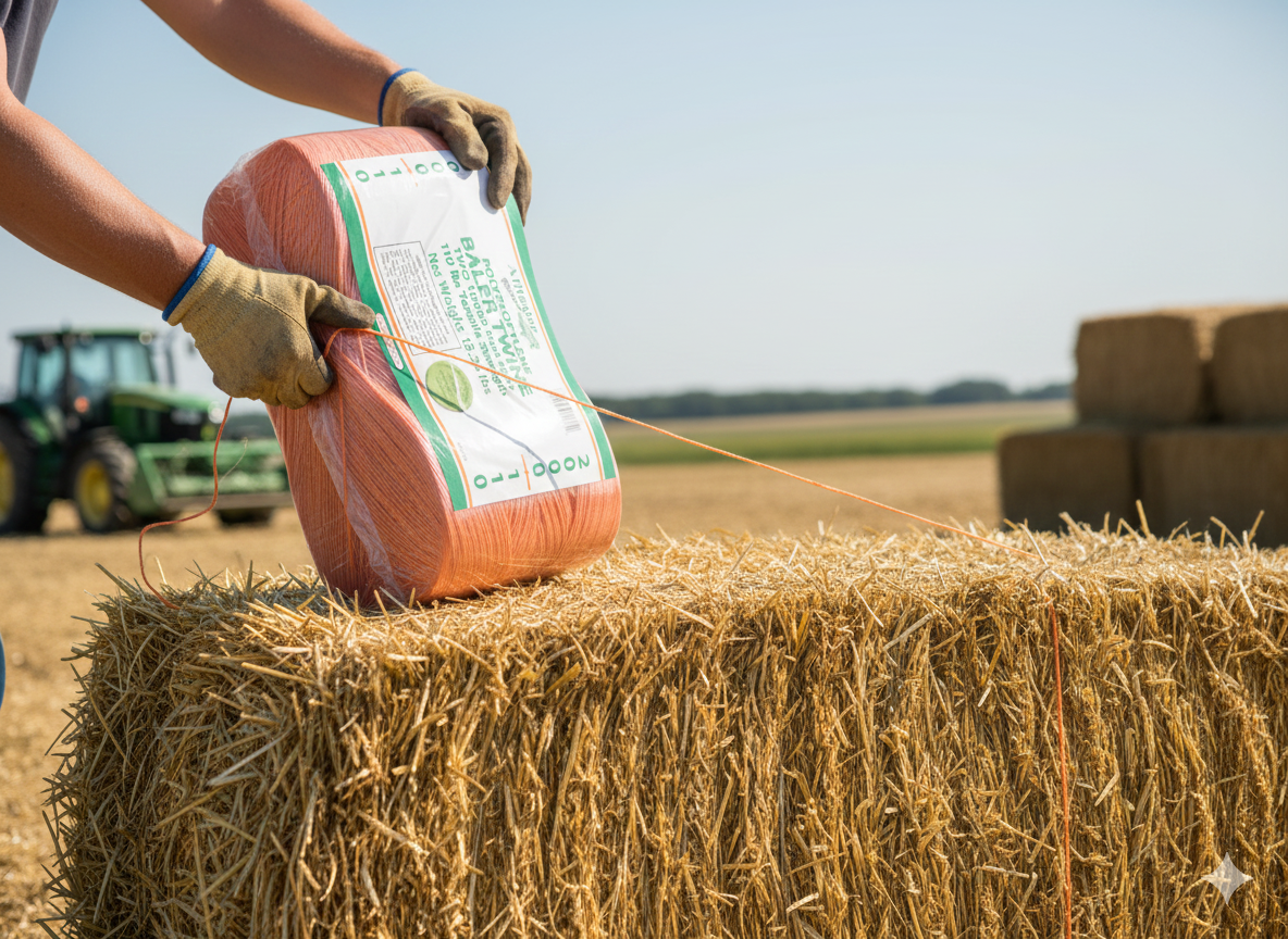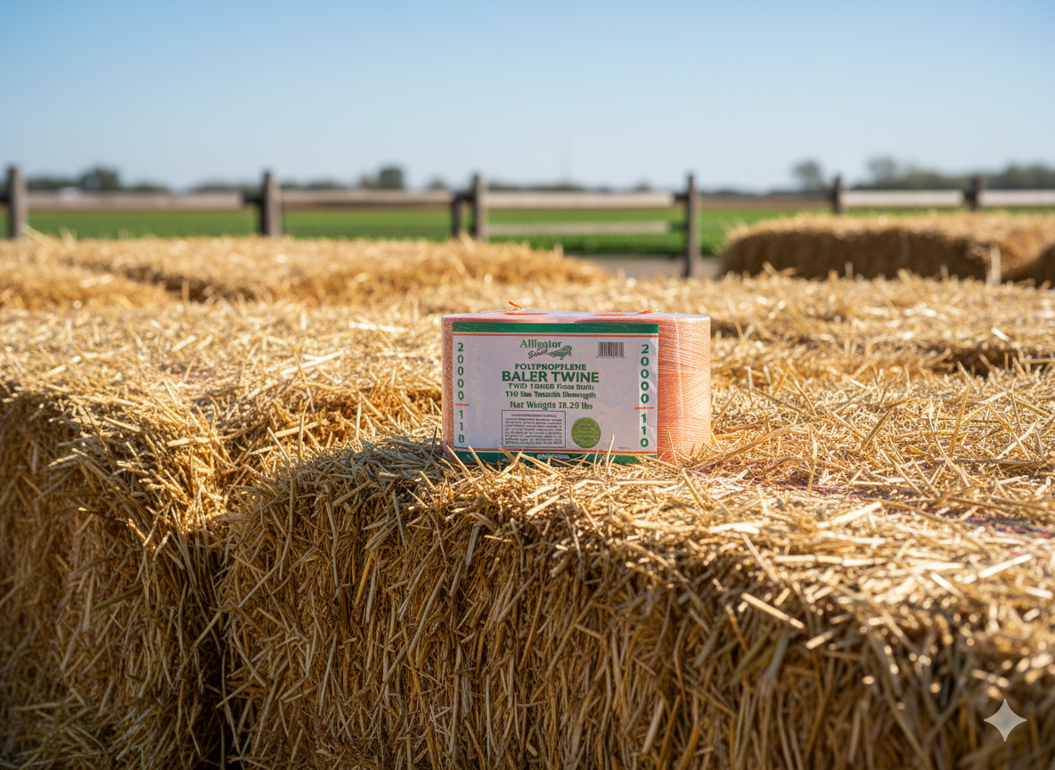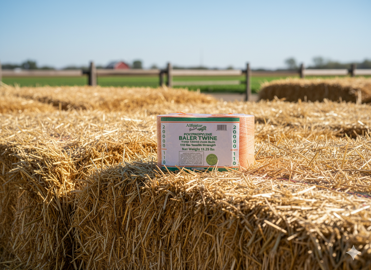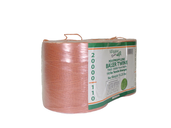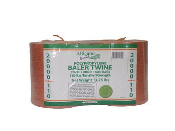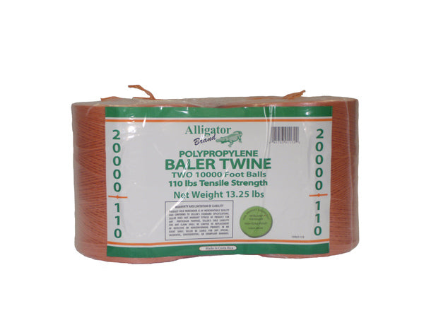 Alligator Brand 20,000 ft orange poly baler twine with UV stabilization and rot resistance. Includes two 10,000 ft spools. Approx. 250 lb tensile strength and 130 lb min knot strength for reliable outdoor tying and baling.
