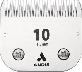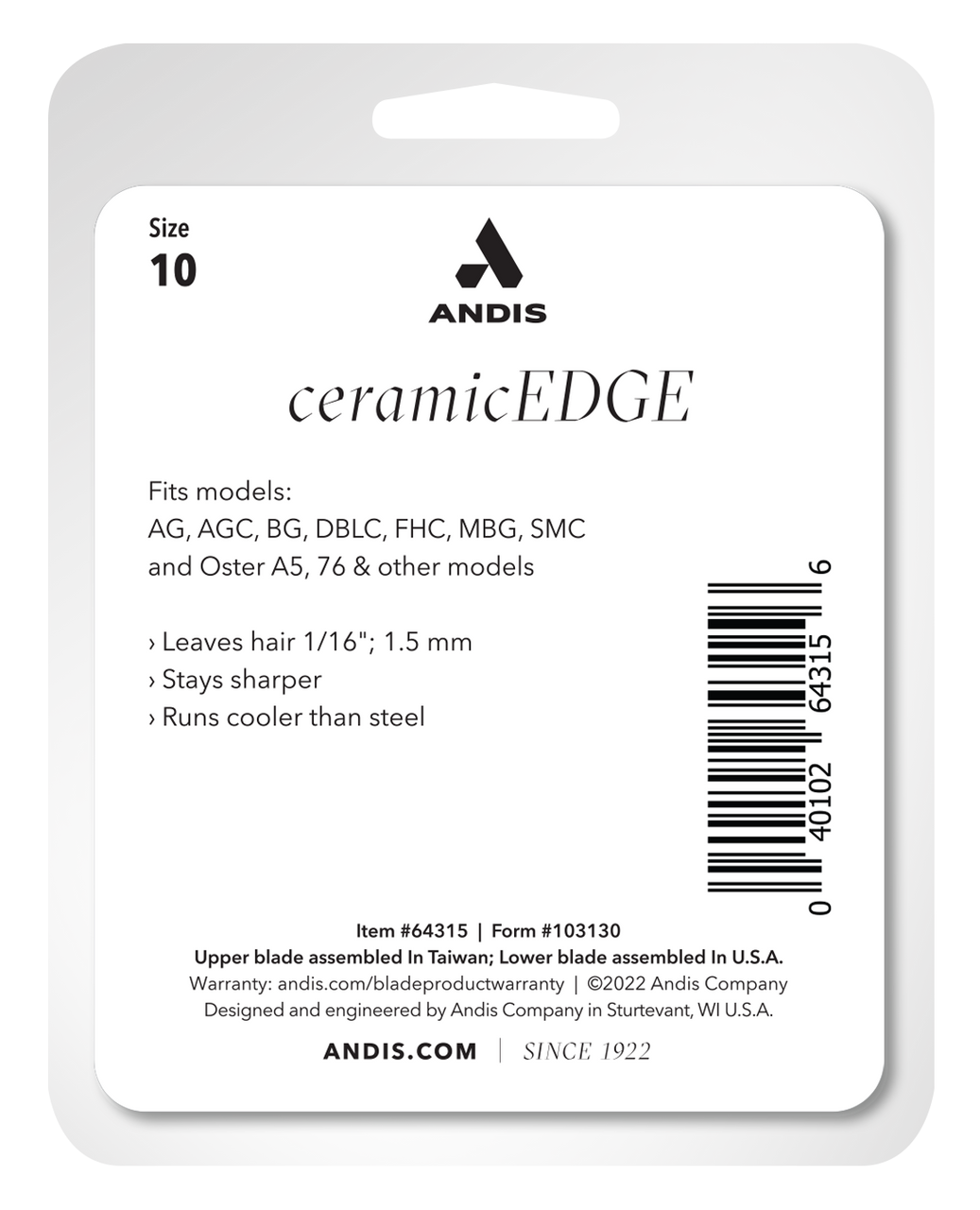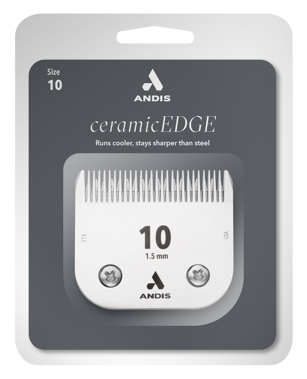 Andis Ceramic Edge Size 10 detachable pet clipper blade features carbon-infused steel with certified zirconium oxide for superior durability. Runs 50% cooler than conventional steel blades with 1/16" cutting length. Rust and heat resistant for comfortable grooming. Compatible with Andis AG, AGC, BDC, and other detachable blade clipper series.