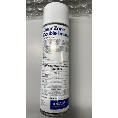 Clear Zone Double Impact Farm Fly Spray by BASF is formulated with two active ingredients and a synergist to provide a quick knockdown of flying insects and residual activity that lasts for hours. Easy to use, designed for heavy traffic areas. The treated area should be vacated and well-ventilated after application.
