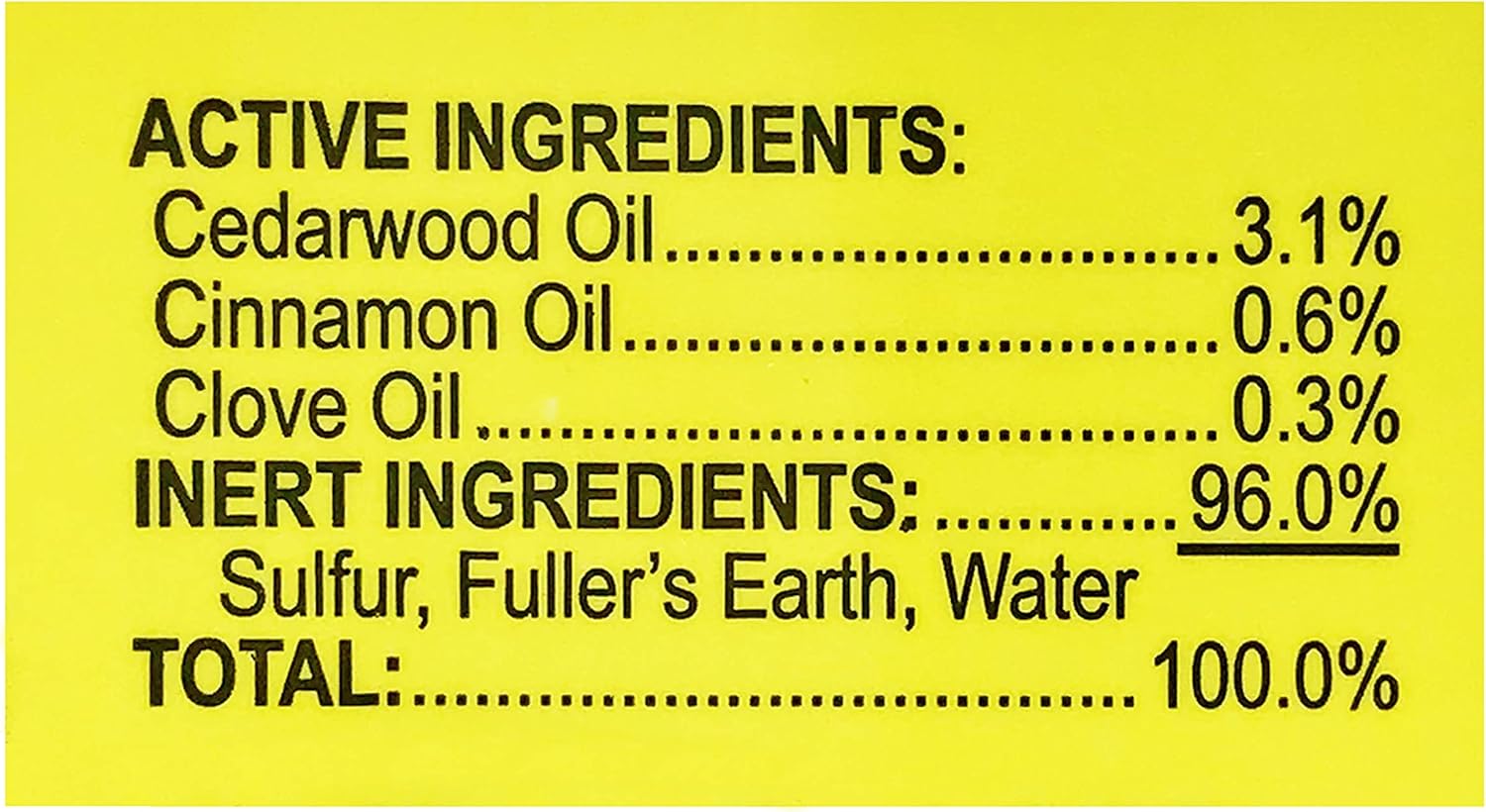 Contains clove oil, cedar oil, cinnamon oil, and sulfur.