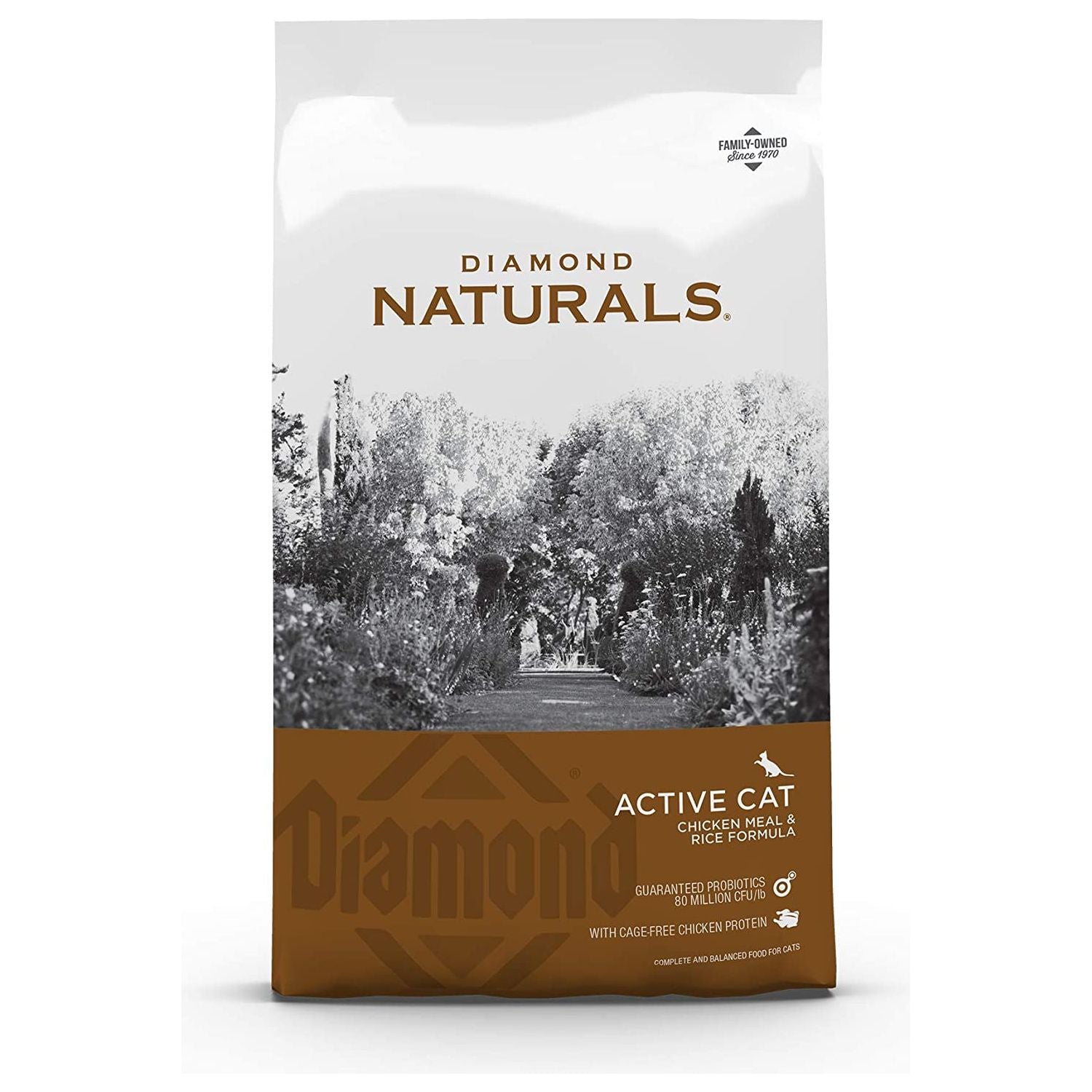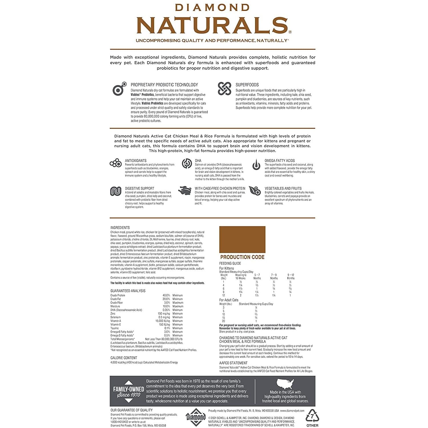Made with ingredients of exceptional quality, Diamond Naturals provides complete, holistic nutrition for every pet. Each Diamond Naturals dry formula is enhanced with superfoods and guaranteed probiotics, for optimal nutrition and digestive support. Diamond Naturals Active Cat Chicken Meal & Rice Formula is formulated with high levels of protein and fat to meet the specific needs of active adult cats. Also appropriate for kittens and pregnant or nursing adult cats, this formula contains DHA to support brain and vision development in kittens. This high-protein, the high-fat formula provides high-power nutrition in every situation.