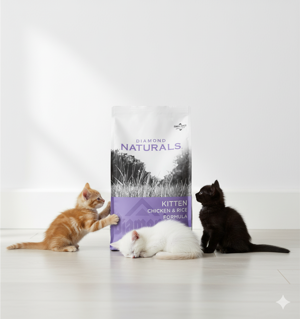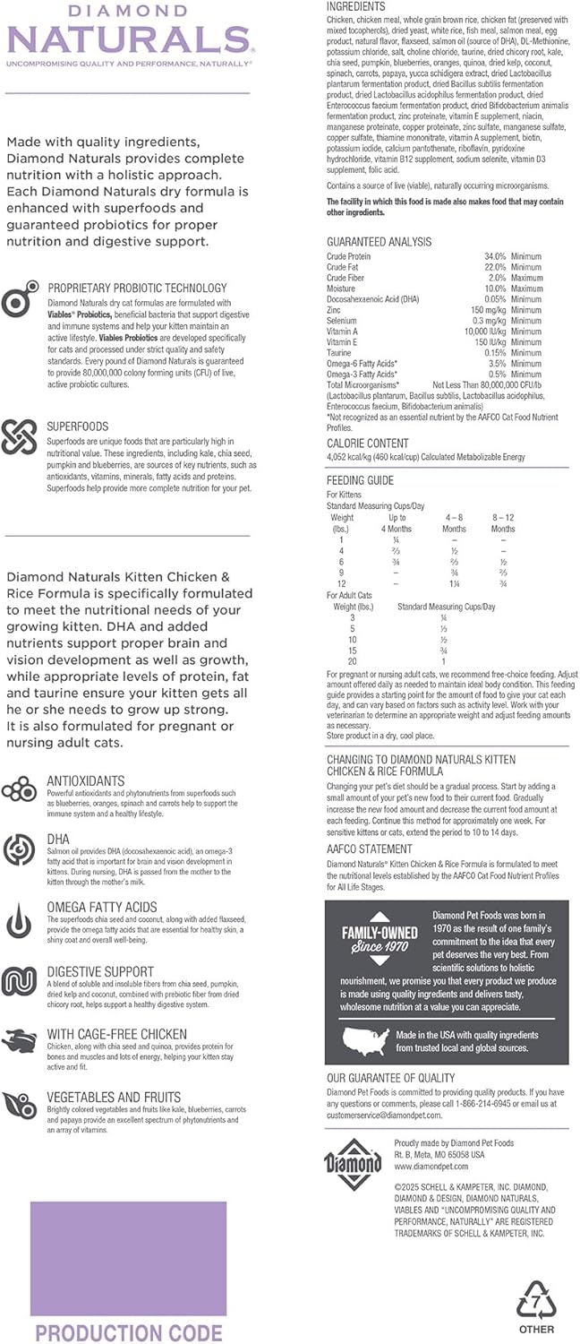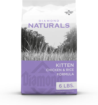 Diamond Naturals kitten formula with cage-free chicken as first ingredient. Complete balanced nutrition for growing kittens. Omega fatty acids, probiotics, taurine. No corn, wheat, fillers, artificial ingredients. Made in USA. 2.72 kg bag.