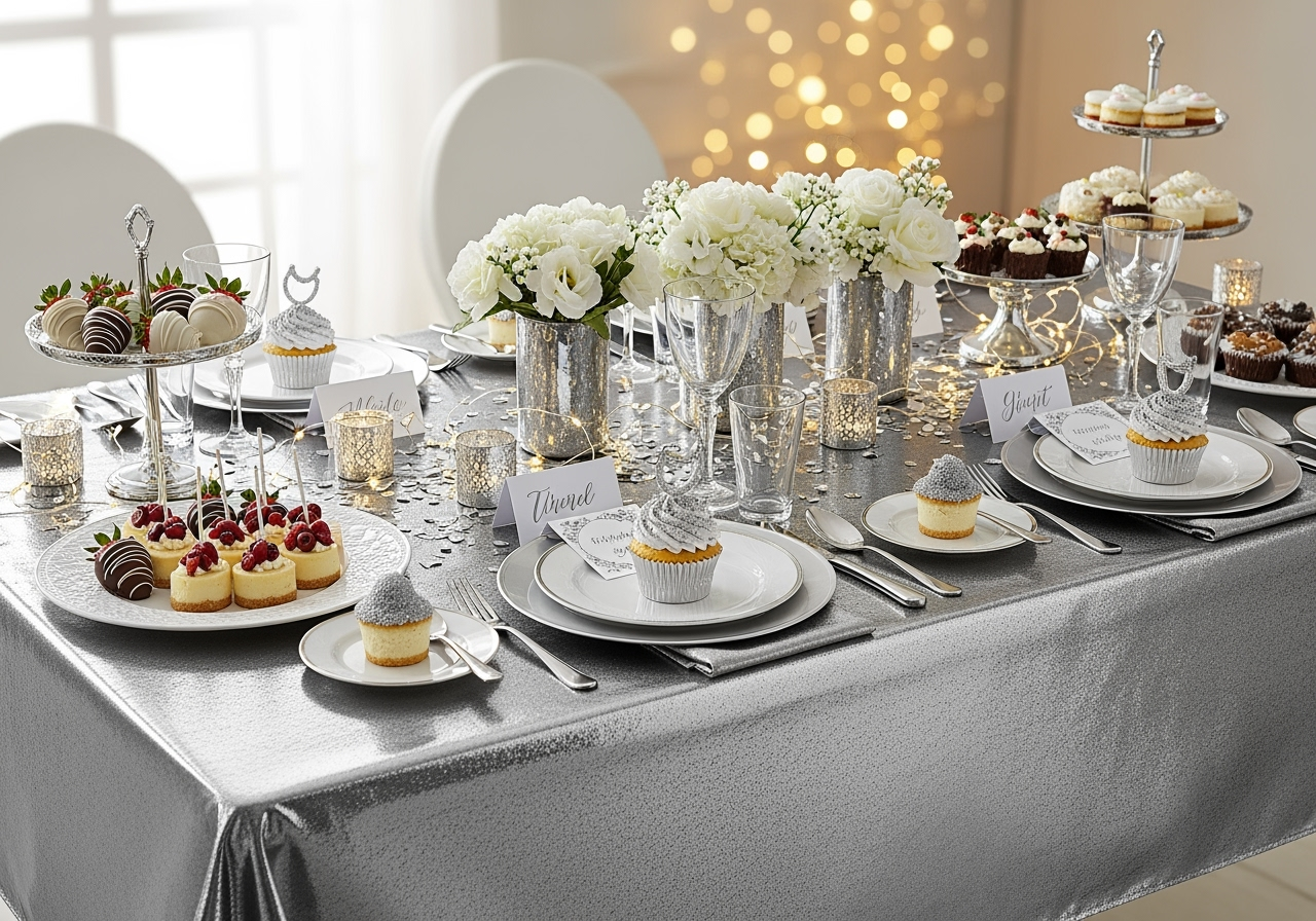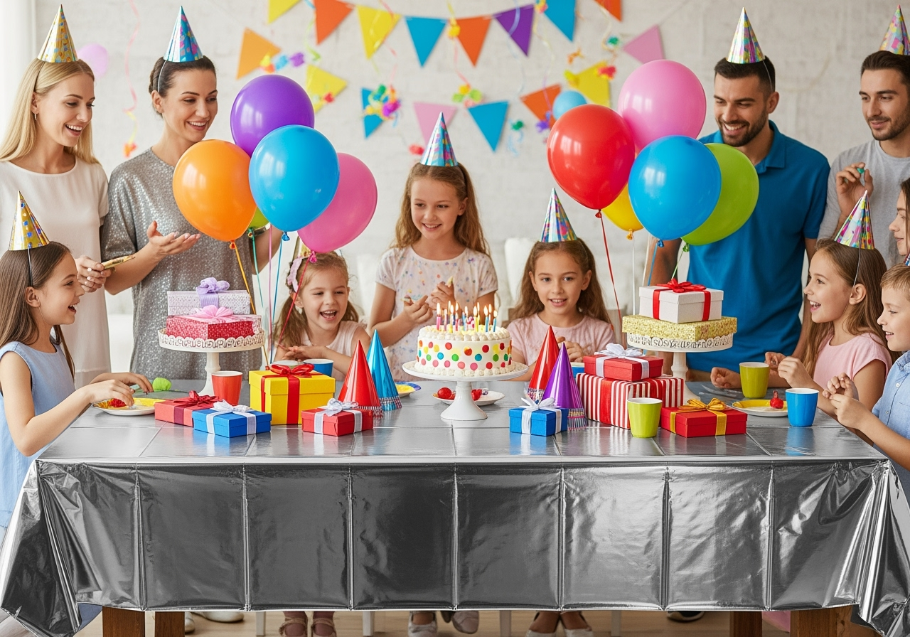 Create a glamorous look at your next event with this metallic silver table cover. Great for weddings, birthdays, baby showers, and special occasions.