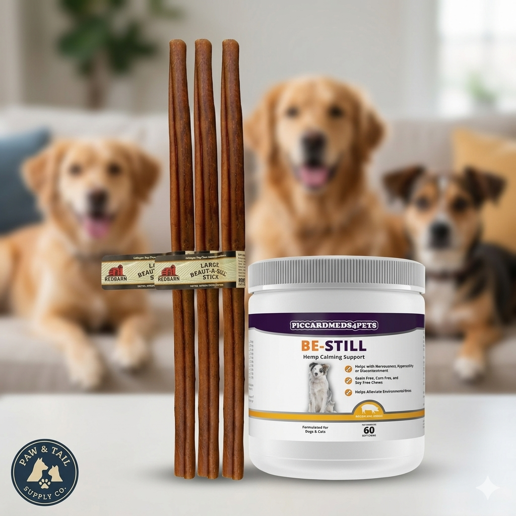Give your dog natural relaxation support while satisfying their chewing instincts with this wellness bundle featuring PiccardMeds4Pets Be-Still Hemp Calming Chews and a Beaut-A-Bull Collagen Stick.