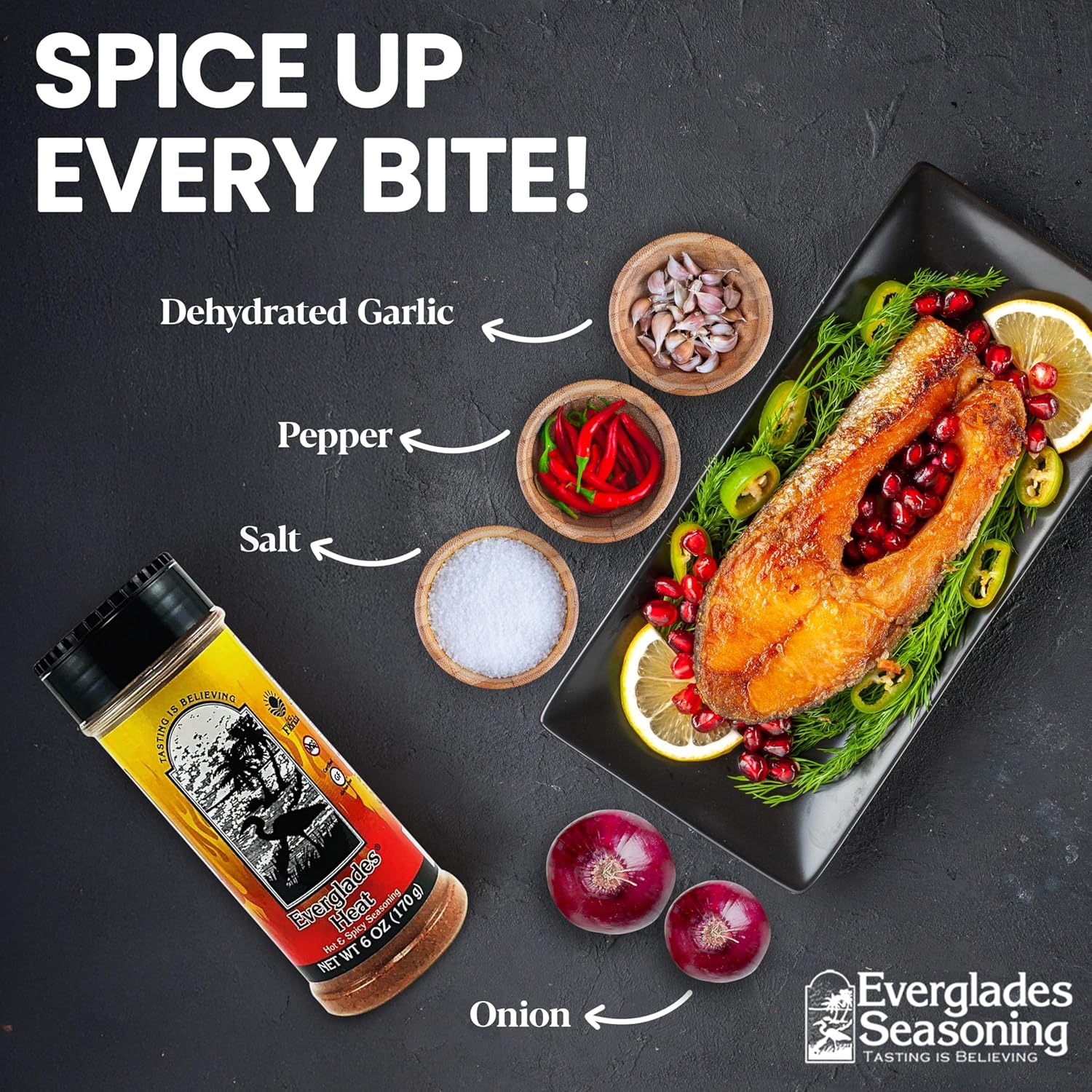 Premium Everglades Heat spicy seasoning blend with red pepper for wings, chili, fish & BBQ. No MSG, certified gluten-free. Made in USA. Adjustable heat level - mild to hot. Perfect flavor enhancer for tacos, fajitas, soups and grilling.