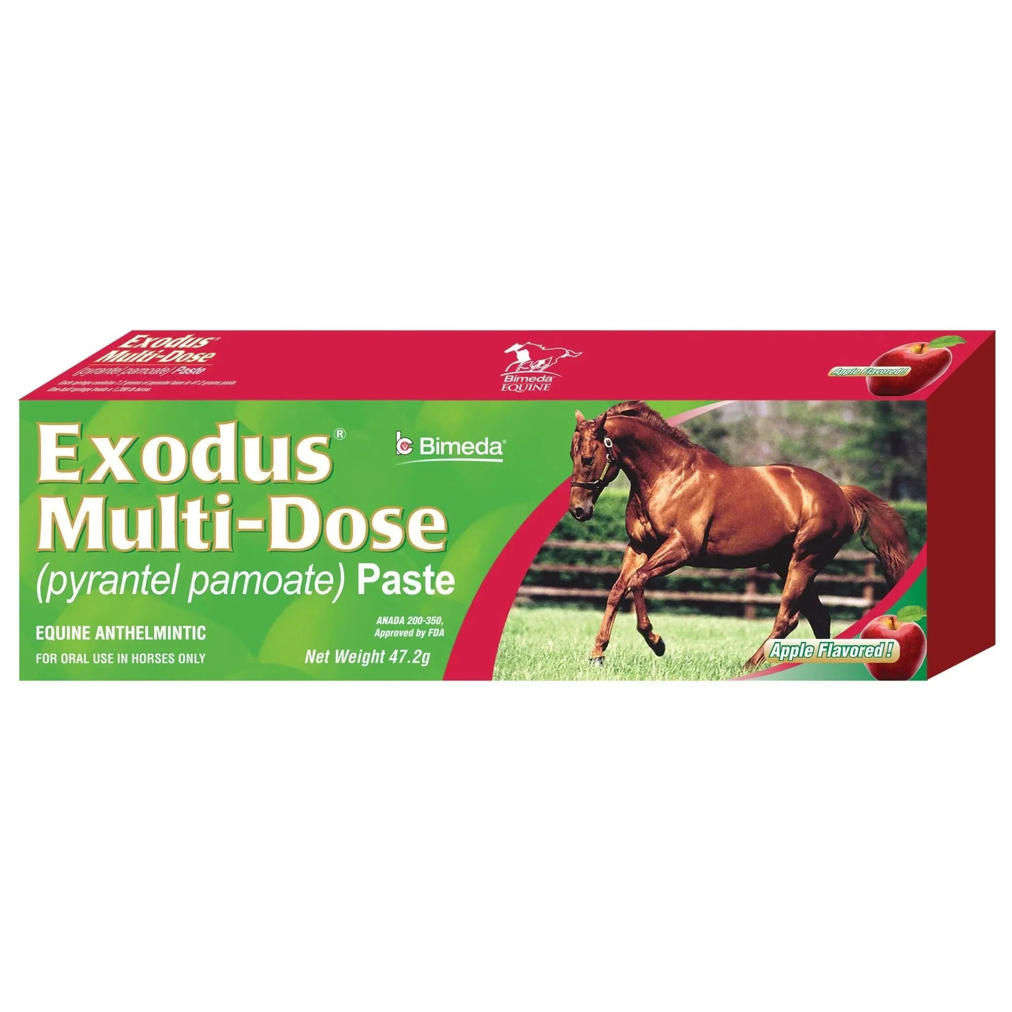 Exodus 47.2g Multi-Dose Pyrantel Pamoate Wormer offers an effective apple-flavored equine anthelmintic paste designed for easy oral administration. Each syringe provides eight weight-based increments, ensuring accurate dosing at 3 mg pyrantel base per pound of your horse’s body weight. Convenient dosage marks cover weights from up to 300 lb (1/8 syringe) to 1200 lb (½ syringe), making it simple to protect your horse from worms with precision and ease.