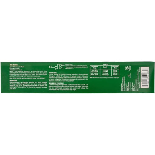 Exodus Paste (pyrantel pamoate) is a pale yellow to buff paste containing 43.9% w/w pyrantel pamoate in an inert vehicle. Each syringe contains 3.6 grams pyrantel base in 23.6 grams paste. Each milliliter contains 171 milligrams pyrantel base as pyrantel pamoate.