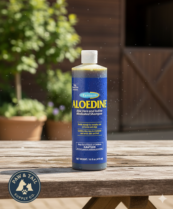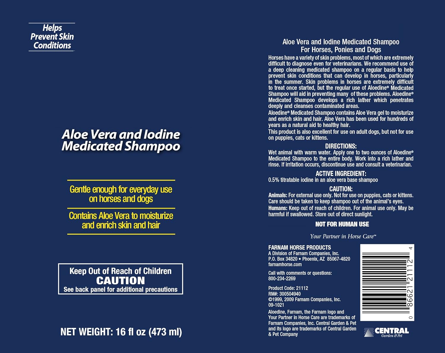 Farnam Aloedine Medicated Shampoo combines iodine with aloe vera to help prevent skin conditions that can develop in horses with sensitive skin, particularly in summer. Develops a rich lather that penetrates deeply and cleanses contaminated areas. Contains aloe vera to moisturize and enrich skin and hair. Gentle enough for everyday use on horses, ponies, and adult dogs. 16 oz bottle.