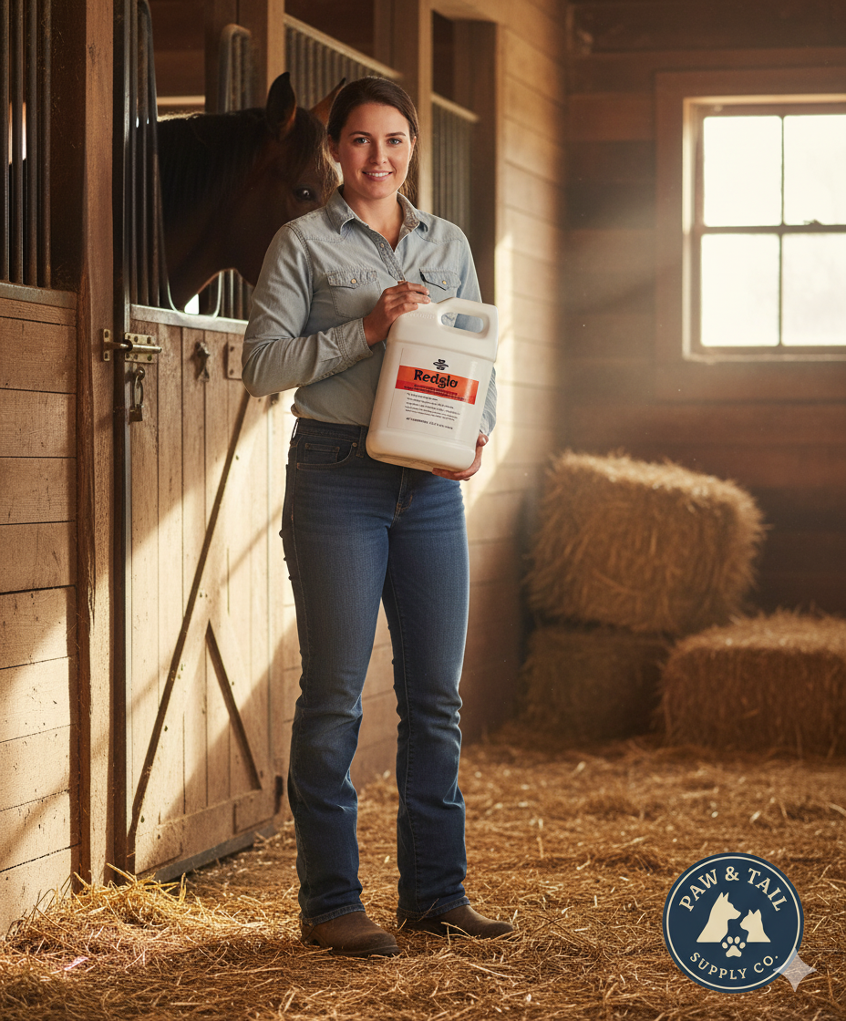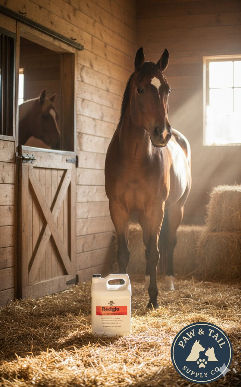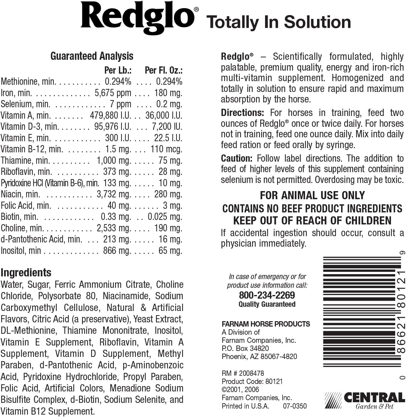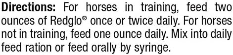 For horses in training, feed two ounces of Redglo once or twice daily. For horses not in training, feed one ounce daily. Mix into daily feed ration or feed orally by syringe.