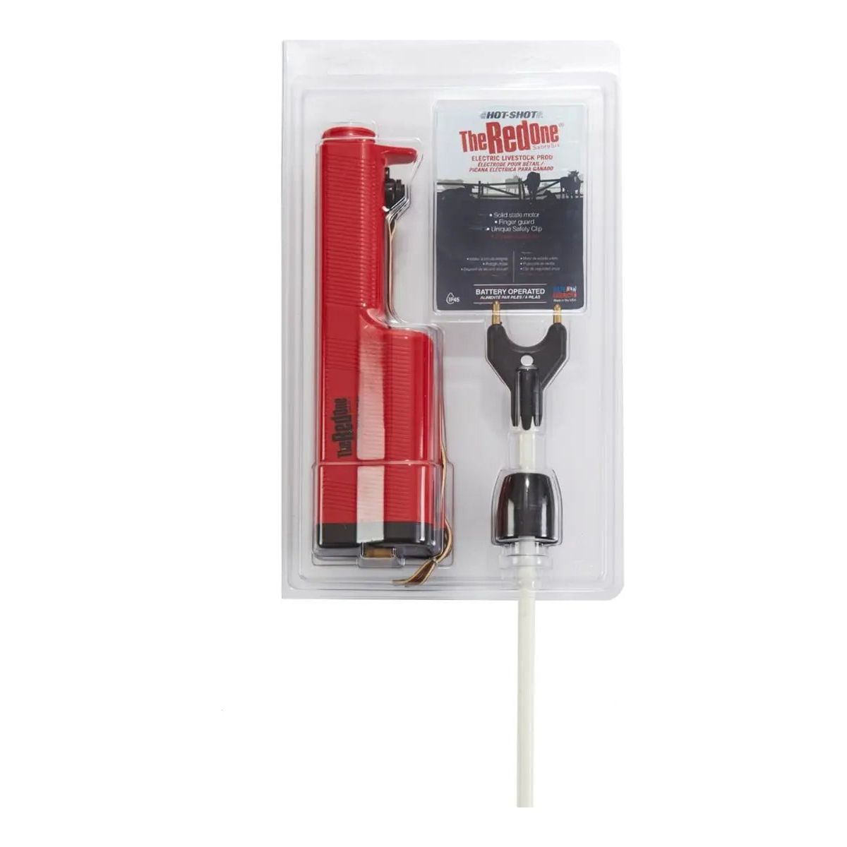 SABRE-SIX® The Red One® is a battery-operated livestock prod at an economical price. Hot-Shot® continues to lead the industry with our dependable prods. Every unit is factory tested to high performance standards, making it the ongoing brand of choice for farmers, ranchers, and professional stock handlers and haulers. When used correctly, electric prods are a time-tested, humane way to aid in the movement of livestock; be sure to read and understand all documentation included before using this product. Permanently sealed, maintenance-free, solid-state motor resists damage by dirt or moisture. Features a finger guard for added protection. Latigo carrying strap and six C-cell batteries included. Comes with an interchangeable 36 inch fiberglass shaft. Other shaft lengths and styles are available.