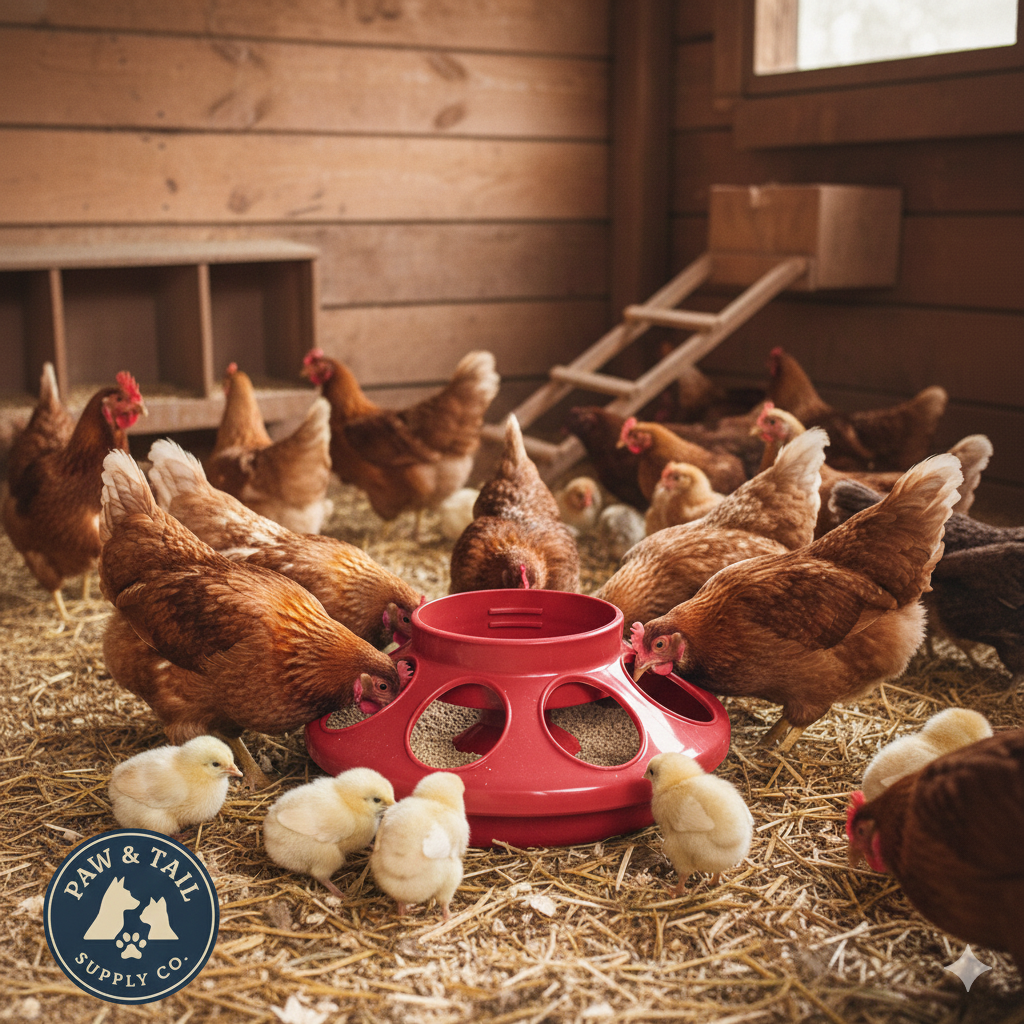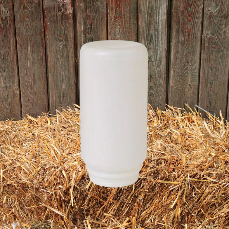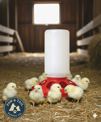 Little Giant 1 Qt Plastic Baby Chick Feeder Jar & Base Set in red. Durable, lightweight with 8 openings and ribs to reduce spillage. Screw-on jar for feed or water; ideal for baby chicks and small poultry.
