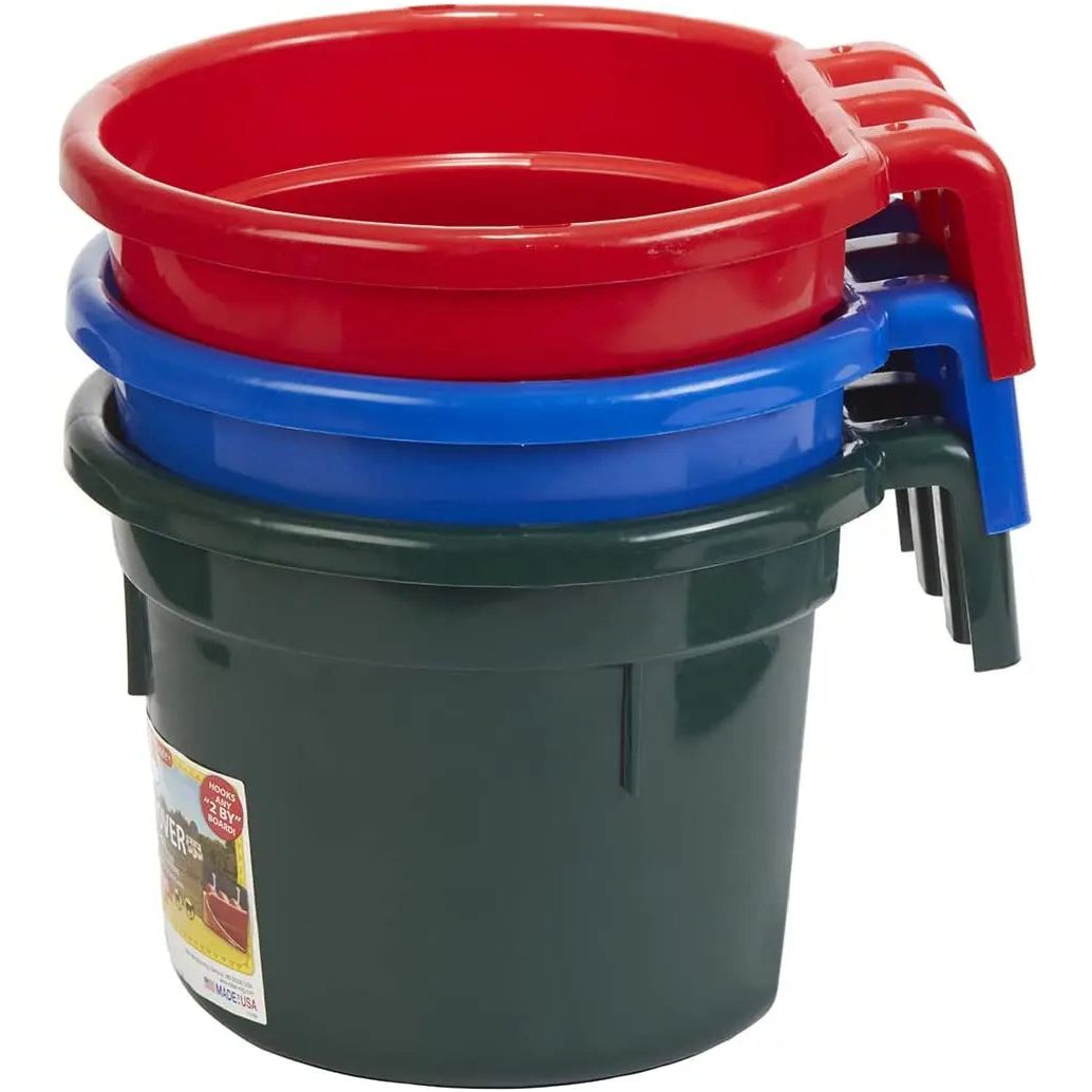 Molded-in bracket fits easily over any 2-by-wide board to create a sturdy feed pail anywhere, with no tools or installation required. Two eyelets allow for permanent mounting with screws if desired (screws not included). Perfect for goats, sheep, alpacas, llamas, and small horses. Impact-resistant DuraFlex plastic pail is 11.375 inch diameter by 8.5 inches high, 12.5-inch overall width including bracket; holds 8 quarts (2 gallons). Available in several colors.