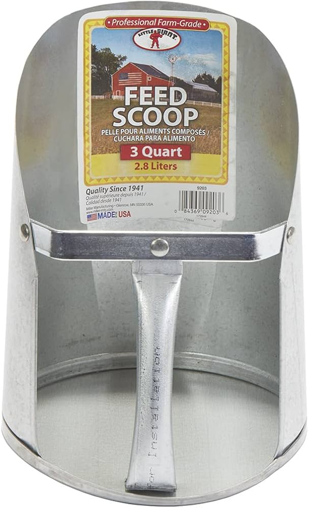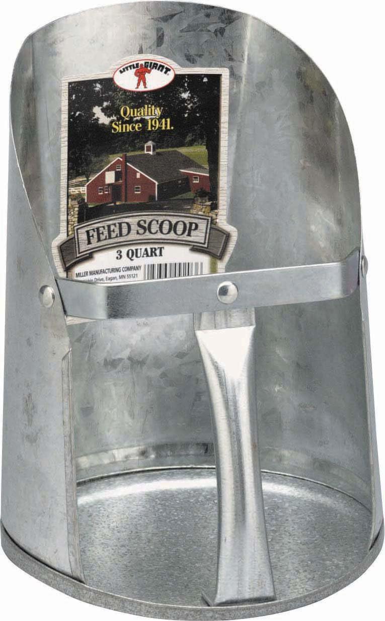 The metal feed scoop is perfect for big jobs. This large scoop has an enclosed design that reduces spillage.