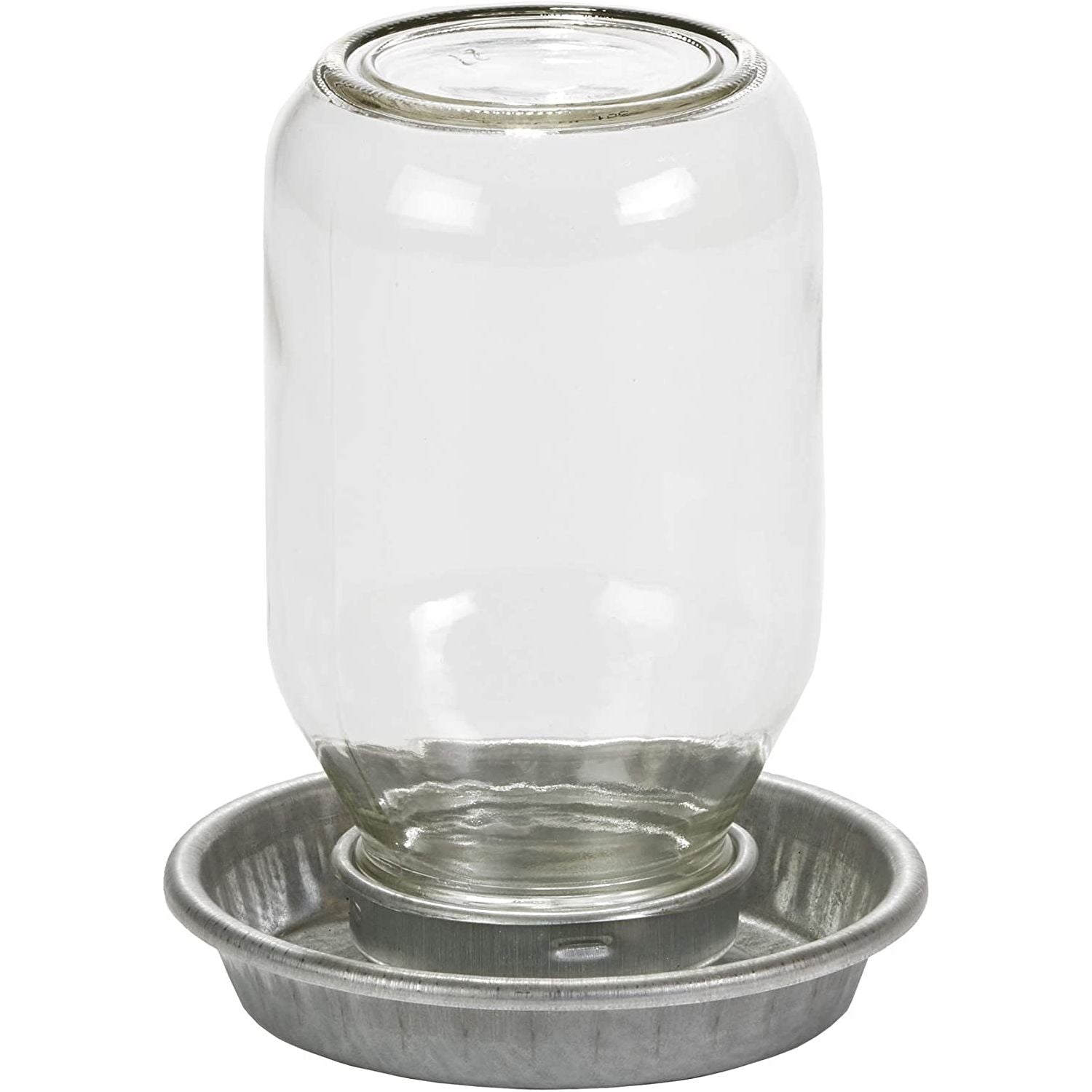 This gravity chick waterer comes fully assembled and features a glass mason jar. Easy to fill and clean, it holds 1 quart of water. The base is made of heavy-duty galvanized steel with rounded, embossed edges to help reduce chafing on a chick's neck and head.