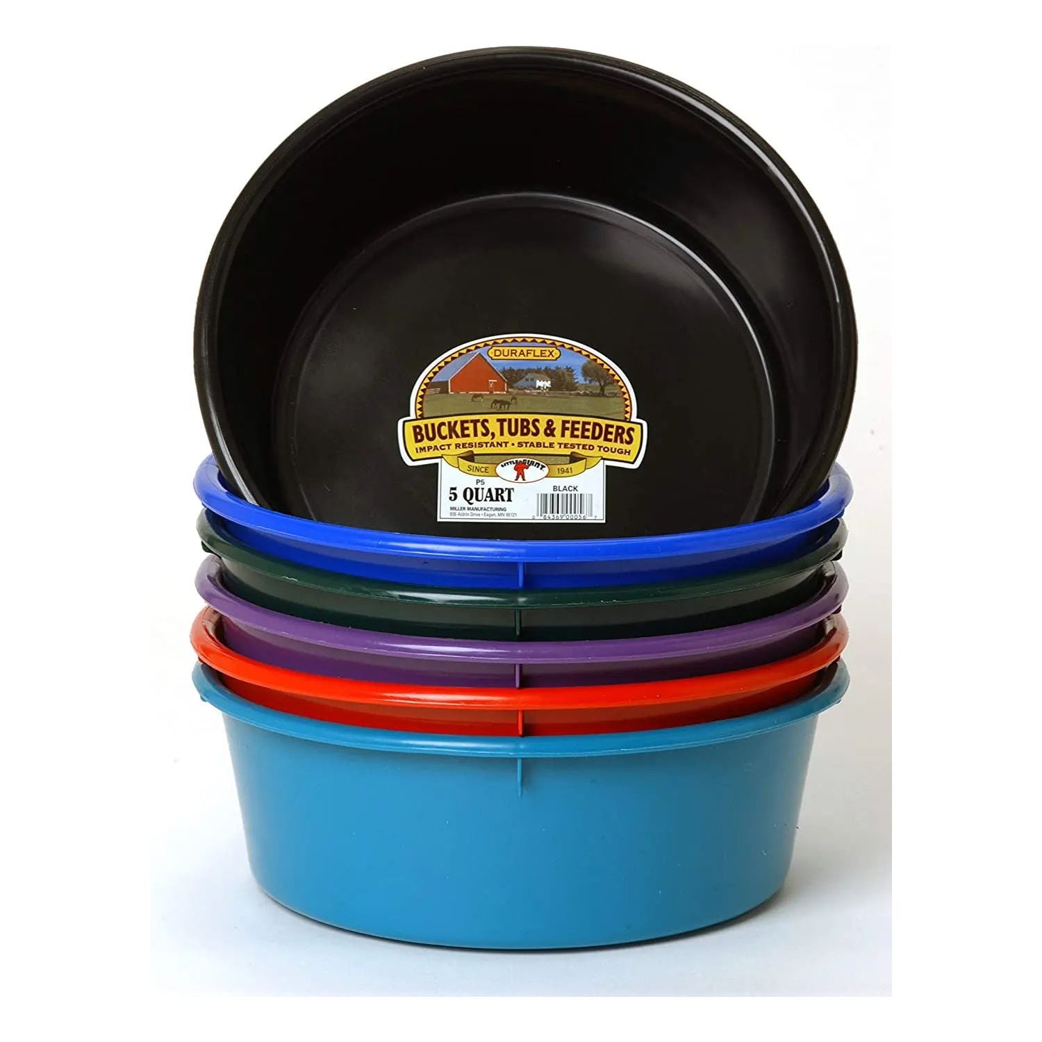You'll never have too many of these versatile pans, made of tough, impact-resistant DuraFlex plastic. Great for pet and livestock feeding, but you'll find a hundred other uses around your farm, ranch, home, or shop. 11.5-inch diameter by 4 inch high, holds 5 quarts (1.25 gallons).