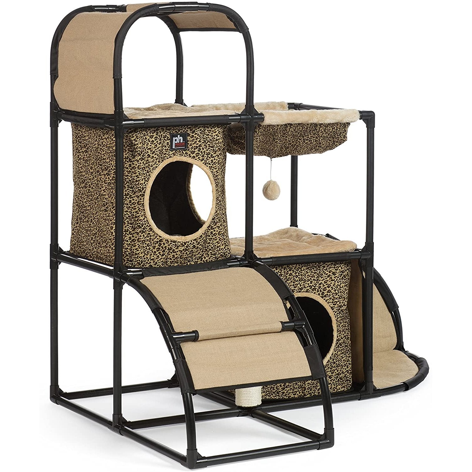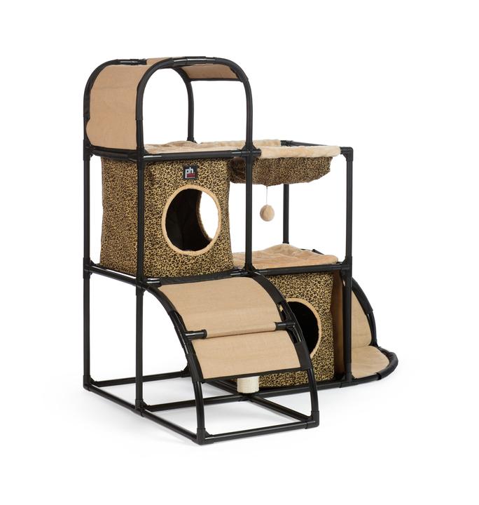 Prevue Pet Products Catville townhome Leopard Print 7235 encourages your cat to be healthy happy and active! watch as kitty engages in energetic activity – playing with the dangling toy, scratching the sisal covered Posts or climbing in, out, over and around the Catville townhome. Cats will happily curl up in either hideaway – one lower-level, one mid-level, each with super soft plush bedding to satisfy all of your cat’s sleeping needs. An additional plush hammock provides the ultimate in lounging pleasure. Two separate scratching Posts encourage exercise as your cat scratches and stretches along the sisal covered Posts, toning muscles while grooming nails and strengthening paws. Durable cloth ramp designed for active jumping, pouncing, climbing and running provides ample opportunity for play. Dens feature more than one doorway making them perfect for games of hide & seek. With areas for playing, napping, lounging, scratching, perching and hiding felines love the full range of amenities created to satisfy behavioral instincts while discouraging destructive behavior and alleviating boredom.