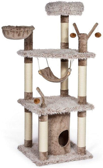 Prevue Pet Products Siberian Mountain features two platforms and a day bed covered in soft plush, a hideout space, jute scratching posts, a basket hammock, a swing hammock, and dangling plush toys. Scratching posts help satisfy natural clawing instincts, helping to keep your furniture safe from destructive restless behaviors. The hideaway, day bed, hammocks, and platforms are coated with soft plush, giving your cat or cats comfortable spaces to play, rest, and relax. Dangling toys will tease your pet and encourage fun and active playtime.