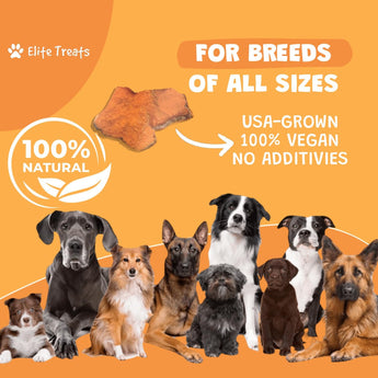 Our sweet potatoes are carefully selected and slowly dehydrated to preserve their natural flavors and essential nutrients. Grain-free vegan treats perfect for puppies, small, medium, and large breeds.